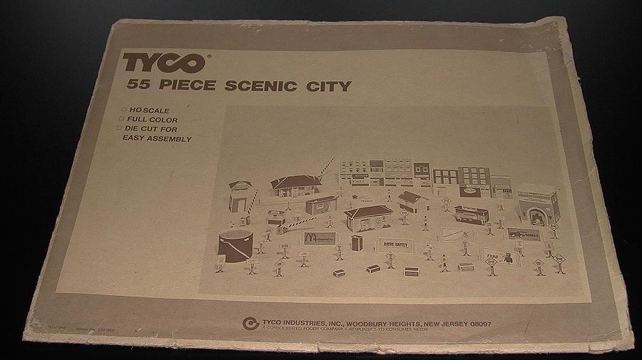V-HO: Tyco set #7517 (EMD-F, reefer, non-operating hopper and caboose) features the 55 piece city as one of its constituent parts. It reposes in the sleeve you illustrated at the box bottom of the set. Its presence as a set component is telegraphed by the transformer box in the lower right hand corner of the master box. Instead of the usual brown box, the 7517 set's transformer box bears a full color photo of the assembled 55 piece city. I don't recall this item included in any other set but assume it was. I also assume it was available for separate sale but--judging from its relative scarcity--suppose it was a lousy seller. Too bad! It is, as you point out, a very intriguing Tyco offering. As a long-time collector of Monte, Built-rite, Ideal and other paper structures I bought my plain-jane 7517 set just to procure the paper city. In this age of color copiers I guess it would be fun to reproduce. Thanks for conjuring up yet another Tyco obscurity from your vault! Magnolia Academy