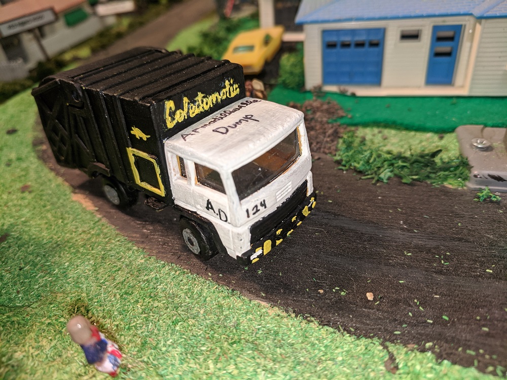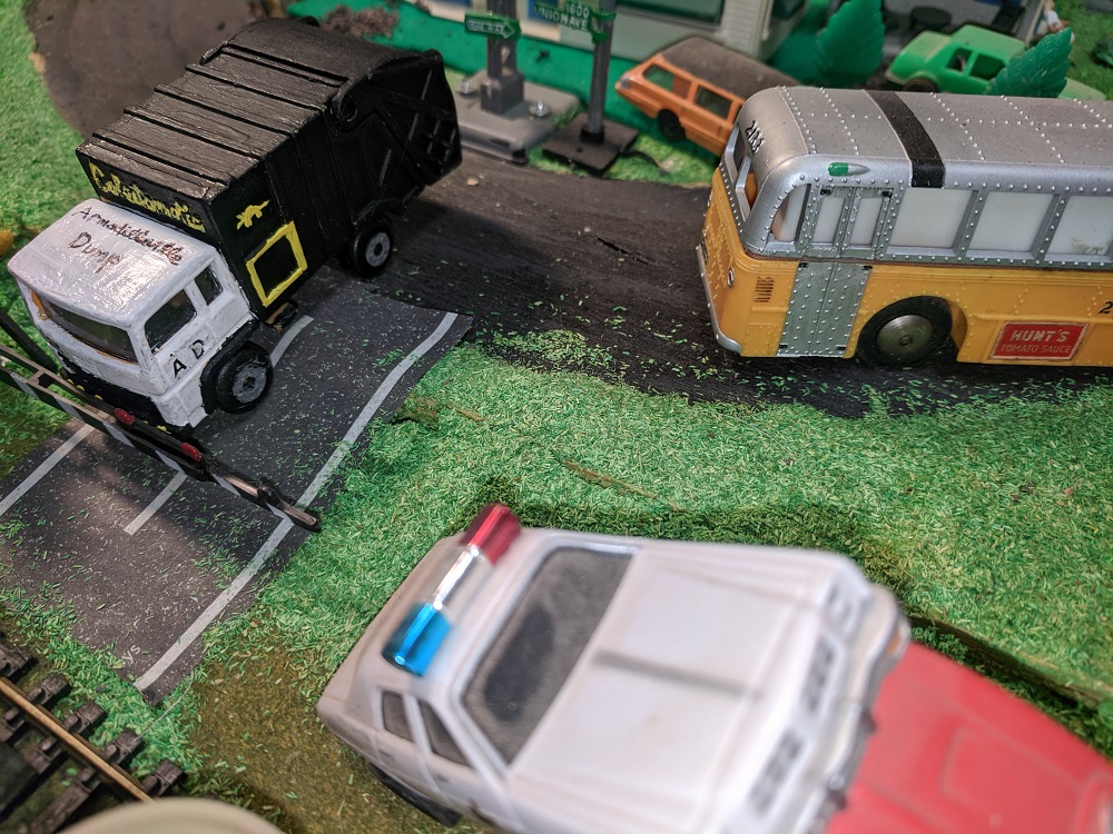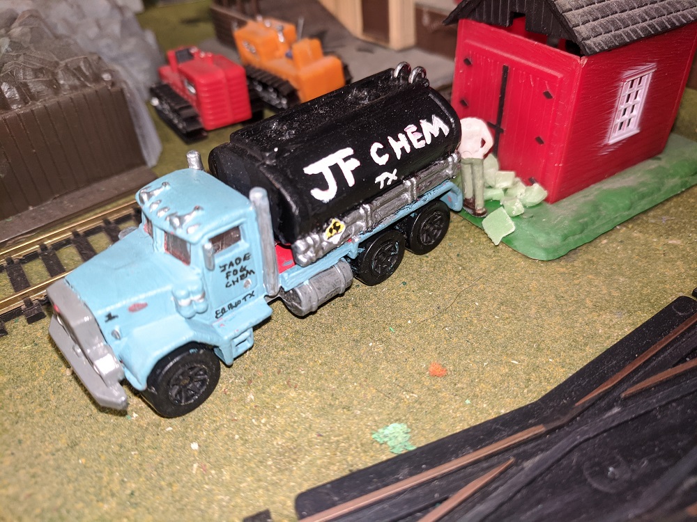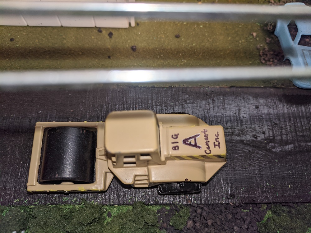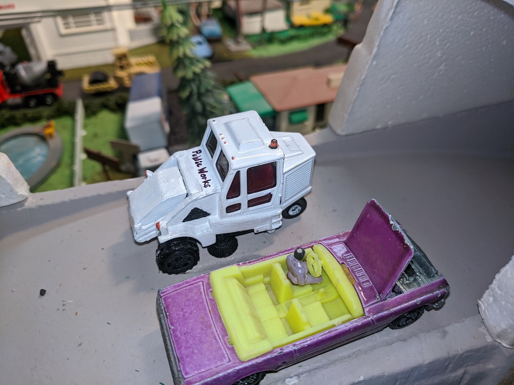 One of the pleasures of Armodilloville is that so many different model railroad artists and collectors have contributed to it. RP Model Railroads, who has done spectacular work with micro layouts and pure Tyco collecting- beyond anyone I've ever heard or seen- provided many of the Hotwheels that underwent a perfect transformation under the steady hand of A-A-Ron. The Hot Wheels were great pieces in their own right, but A-A-Ron transformed them to the next level.