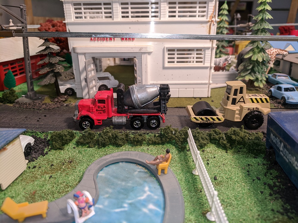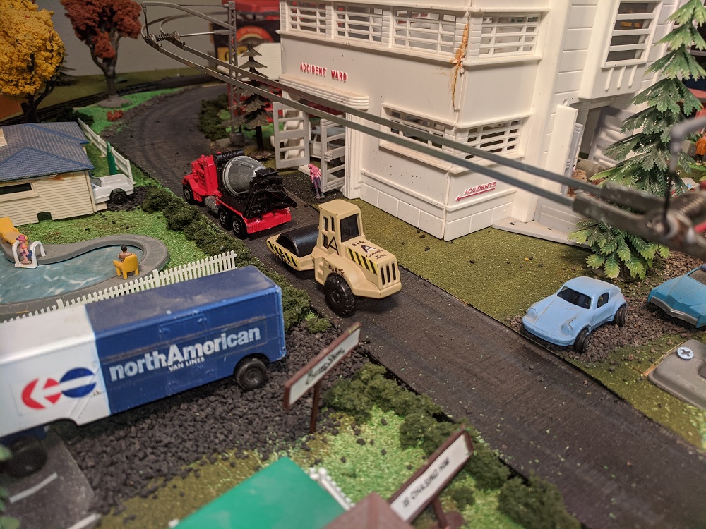 Likewise, the name "Armodilloville," and everything "Jade Fog" is the intellectual and creative contribution of El Rojo Grande. Prior to "Armodilloville," I had settled on the rather lame "Tycomania VII," or something, reflecting that this was the seventh incarnation of the subscale Tyco layout. In actuallity, it might be XII by now, I simply have lost track of the numerous times I pulled it all apart down to the legs and rebuilt it all over again.