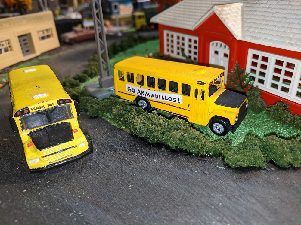 Addition of the new Armodilloville School Bus, #5. I was also a rural school bus driver for the Whately-Sunderland, Massachusetts School District. It took years off my life, before I became a college educated garbage truck driver. Go Armadillos!!!