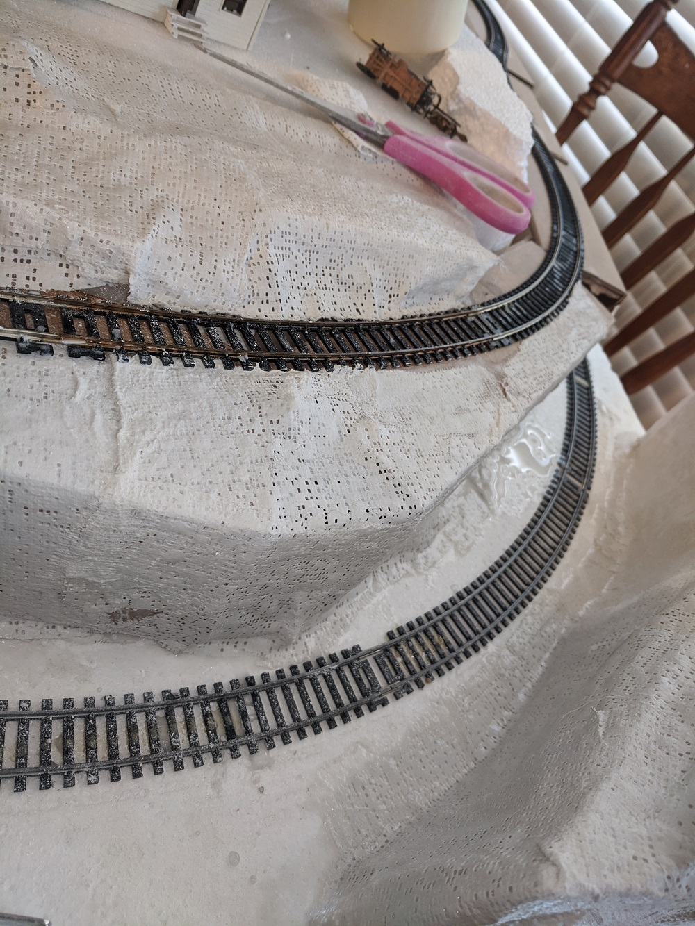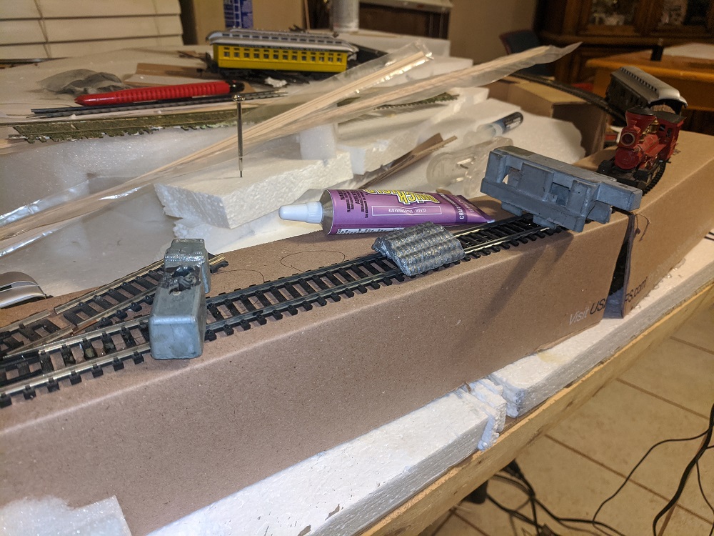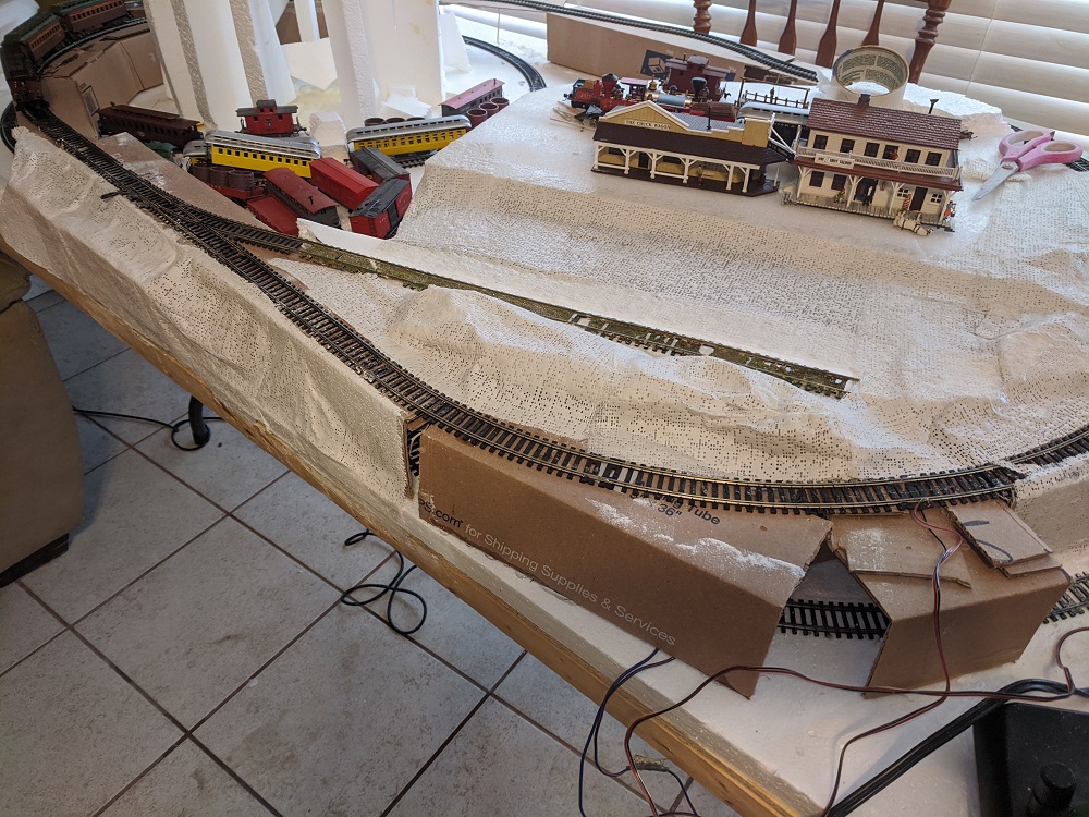 Last time, it was difficult to get an even sub-roadbed for the upper tier of track. While standing in line in the post office, I noticed these mailing tubes, and they were just the right height, 3 inches, and width, 3 inches, and with a little cutting up they fit the bill just right. Tested it out, and the trains run perfectly level.
