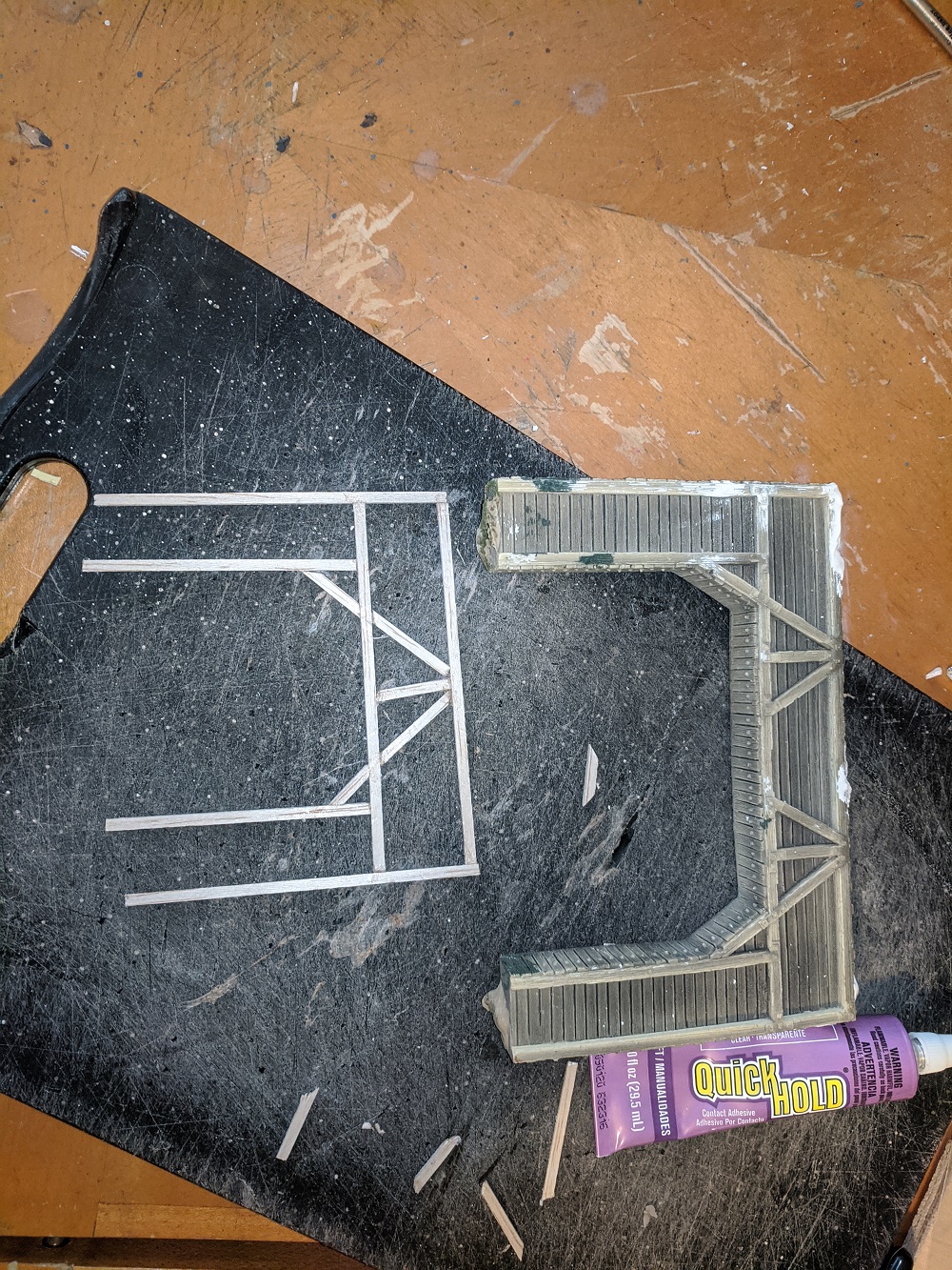Going to be scratchbuilding trestles for the four bridges. This is actually fairly easy, certainly within my skill level. First, Balsa beams are glued to the underside of the tracks, then a jig will be fashioned using smaller Balsa sticks for bents, once jigged up, the trestles will be glued together. If too tall, they can be easily trimed at the base legs to fit.