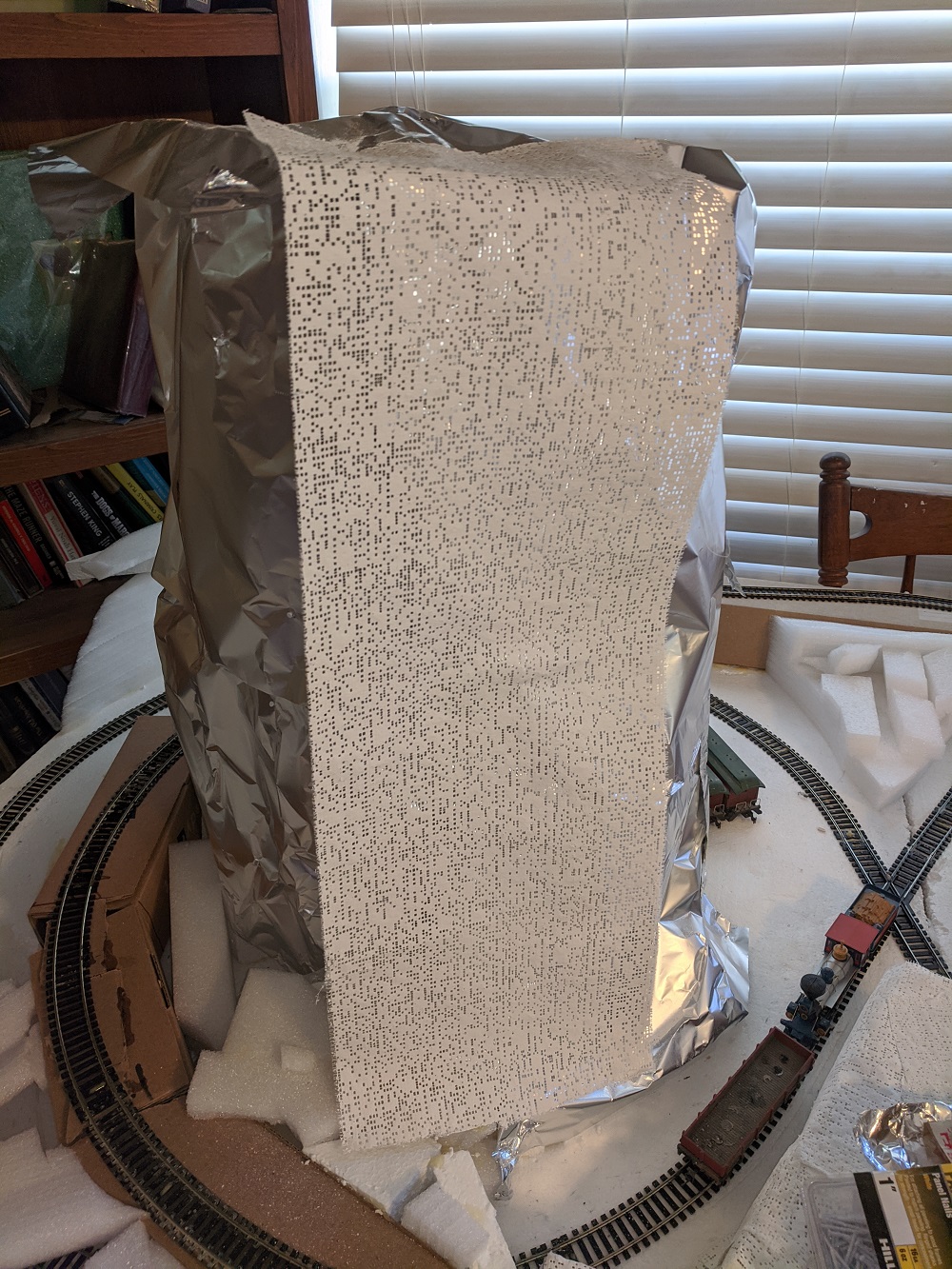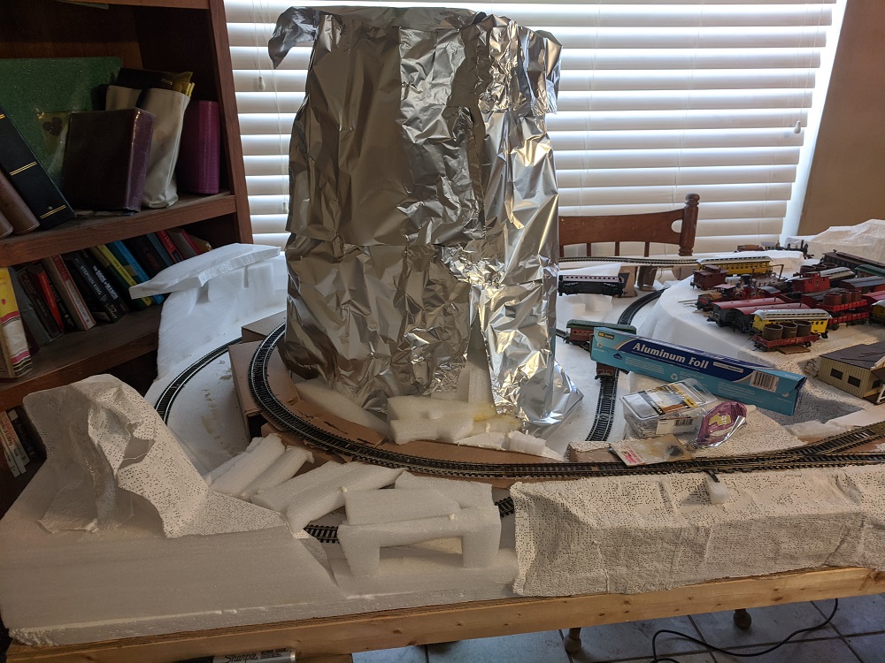 For that I have a novel idea. The butte needs to hold a certain shape of roundness, so over the vertical spines made of foam I am going to wrap those in aluminum foil and over that lay down plaster cloth which will mate up to the base, so it doesn't fly away in a wind.