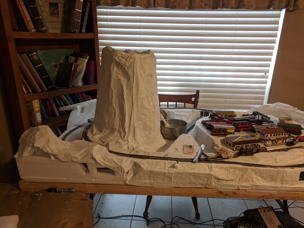 The biggest expense is the plaster cloth for the scenery of the geography. A few dollars can be saved by using loose plaster and soaking a medium of towels, even fabric, but it goes on sloppy and the bowl of it will dry solid while your trying to arrange the strips. Plaster cloth can be dampened and then molded to fit a piece at a time, and can be rewetted while drying to form up a better shape.
