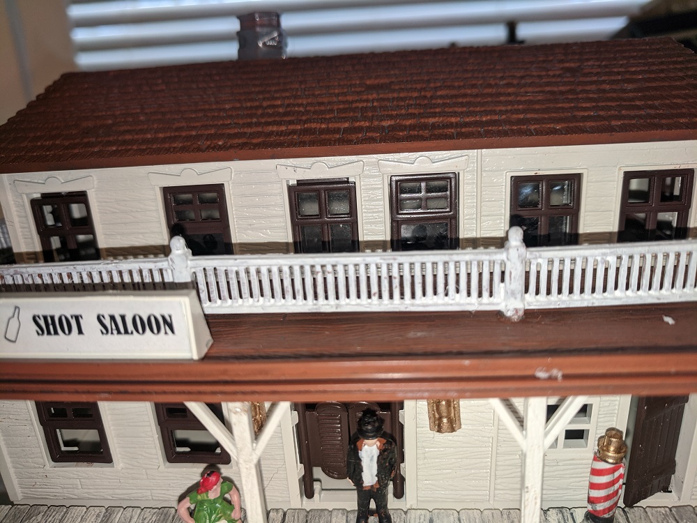 Pleasant hours working on Mormon's Gulch. Plasticville Old West kit looks a little better than Plasticville with a touch of highlighting and added painted detail. I used a wash of used paint thinner to bring out the wood grain effect. Getting a little better at hand painting 1/87 figures, too. I find that dabbing the paint on rather than trying to brush it on allows the paint to find the natural contours.