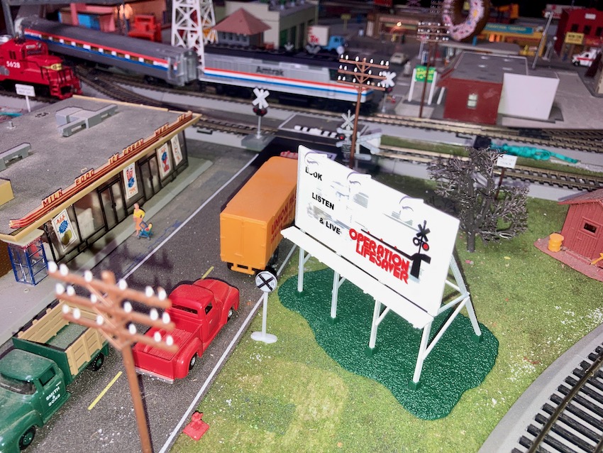 Of course, there are a couple of railroad crossings right near the billboard, so hopefully it does its' job! (Seriously, I remember back in the late 1990s, it was once every 90 minutes a train would hit a person or vehicle in the USA, while nowadays it's every three hours.)