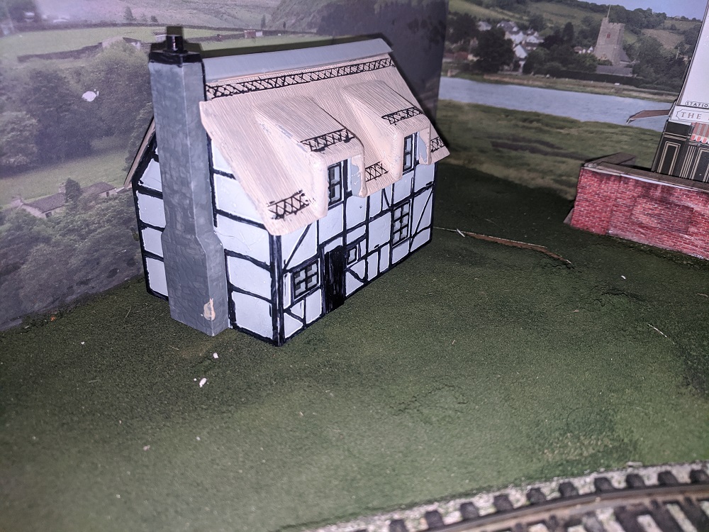 Finishing up this Dapol medieval timber framed cottage, native to England. The kit type has been around forever, but I only recently learned to paint the timbers using a felt tip marker. I used to try to paint the timbers with a brush, and it was very hard going. I think I got the trick from Anderson Paint Shops.