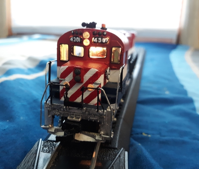 I started out by grinding down a suitable replacement pilot, drilling holes for a pair of Pacific Great Eastern style ditch lights, inatalled a horn and then began the intricate nose and body paintwork. On this unit I intend to add vinyl letters to start, then eventually apply water slides one obtained. Or maybe I'll contact somebody on here who had mentioned doing some vinyl decals for me.