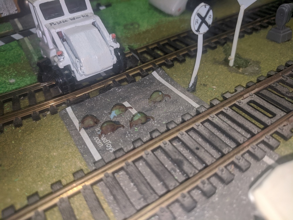 No, those are not giant rats, they are HO scale 3D imaged armadillos. The question is, why are the armadillos crossing the street? To become road kill. The Armadilloville street sweeper is about to close in on them. This particularly esoteric item was suggested to me by El Rojo Grande, who christened, if I am not defaming the word, the Armadilloville layout. Not recommended for children under the age of 60.