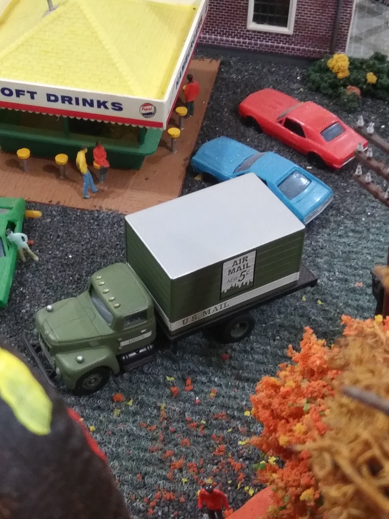 If you knew the history of postage rates, that "Air Mail 5 cents" on the side of the truck could set the era of the layout. I think it's quite a while back. For all of my life USPS equipment has been blue. That's a neat old truck.