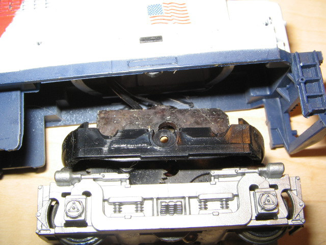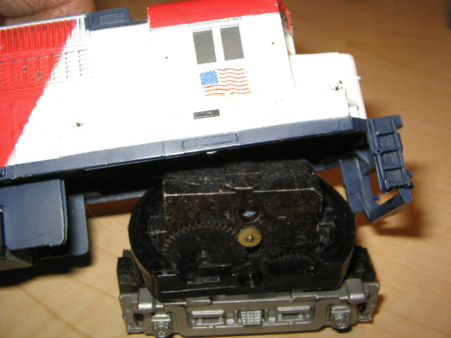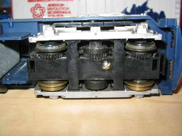 This power torque is like no other. There is only one screw holding the front truck only and the ends snap on to hold completely. This design has to be the first issue power torque truck. All other powertorque tyco's have 3 screws holding truck to motor. The rear truck is the same but screw is missing - only the snap on ends holding it. This Spirit of 76 power train in this configuration is the only one i have ever seen or owned as my collection of these is 10 with the variations. The casting for the motor is also different than other powertorques as is the rear truck casting. The coupler pocket snaps onto truck via prongs like the alco 630 early version. BTW--IT IS A STRONG RUNNER!!!