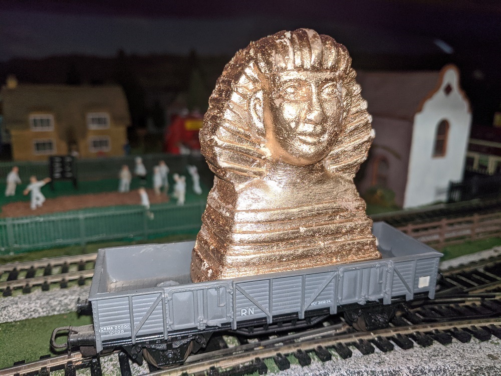 In addition to other aspects of deep history, Egyptology is another fascination. Found this sphinx head in the dollar store, and a few swipes with a paint brush, it has now become a load for Henley. El Rojo Grande did similar upgrades to some plastic dinosaurs, turning them into bronze statues, or perhaps an in vivo bronzed specime, but we'll never know and he's not saying.