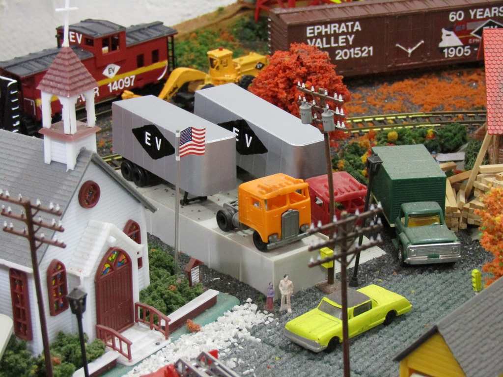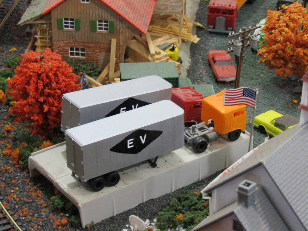 Next, 2 Tyco Ephrata Valley RR trailers, seen at the piggyback dock on the layout. These were formerly common Santa Fe piggyback trailers that I stripped, spray-painted, and then detailed for the EVRR.