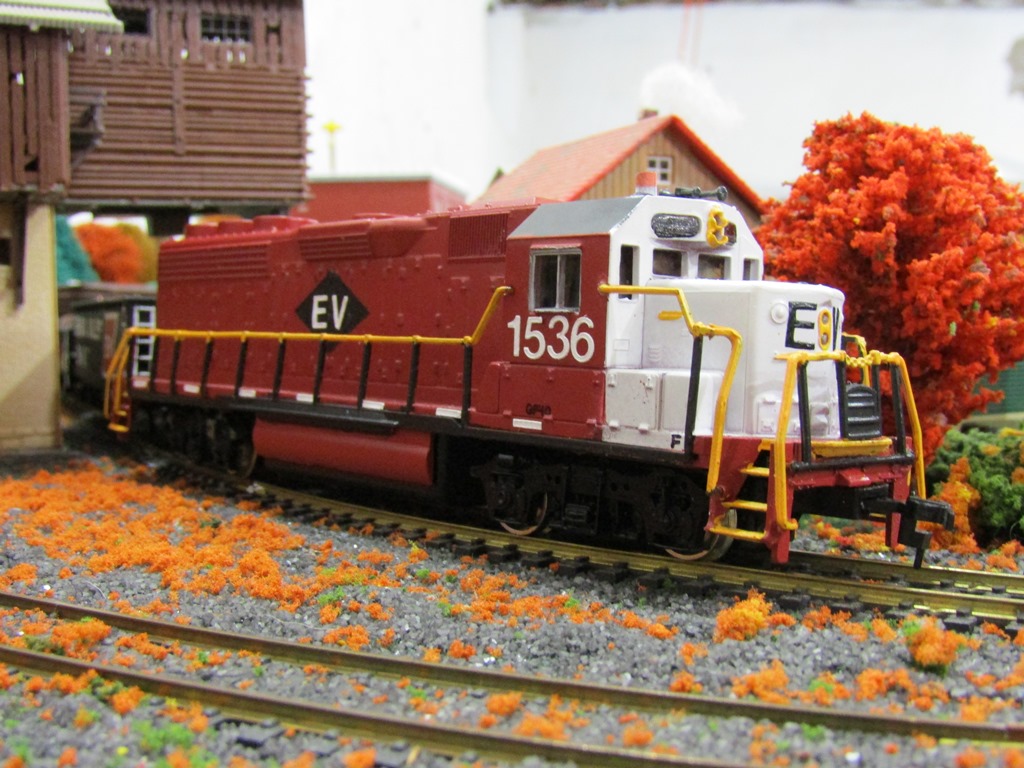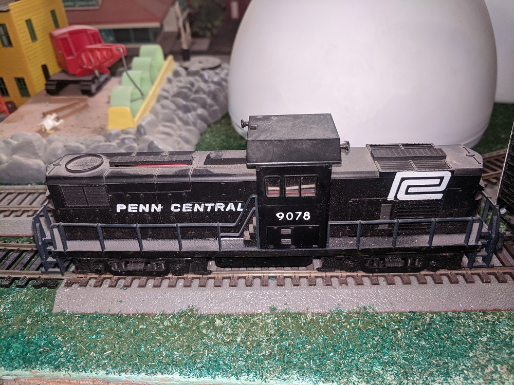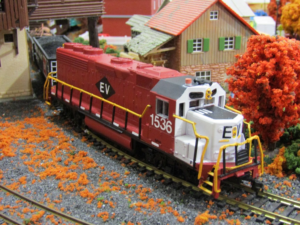 Ephrata Valley RR GP40 #1536, a classic Bachmann diesel. The shell was painted by Aaron, and despite having cracked gears, still rides down the rails with a good motor and headlight. I will either have to repair the gears, replace them, or install a OLD and apparently reliable metal 8-wheel-drive chassis that Bachmann used on their earliest HO-Scale diesel locomotives at the beginning of the 1970's (if I can find a spare one.)