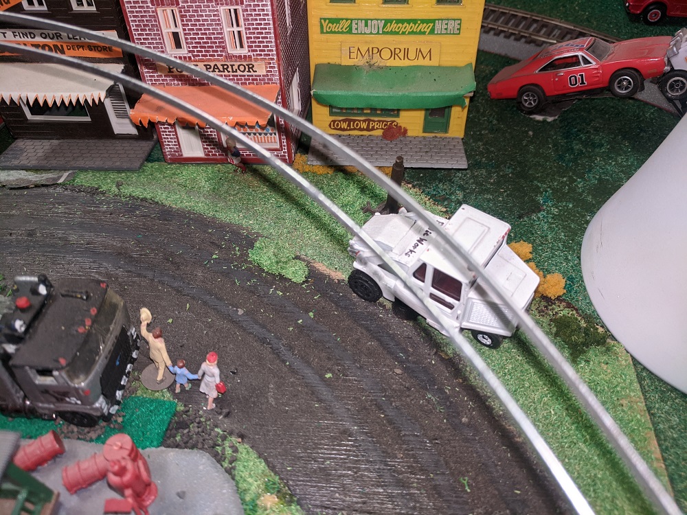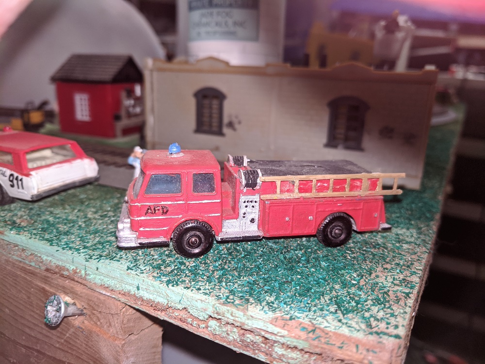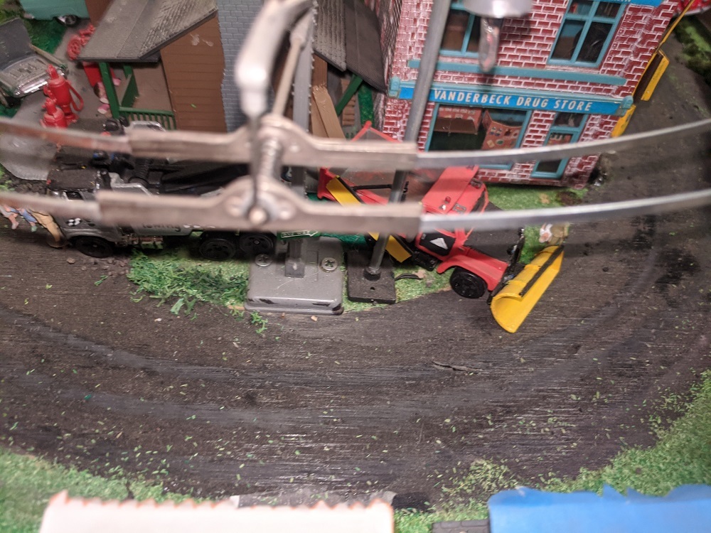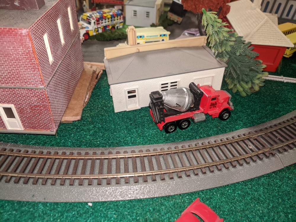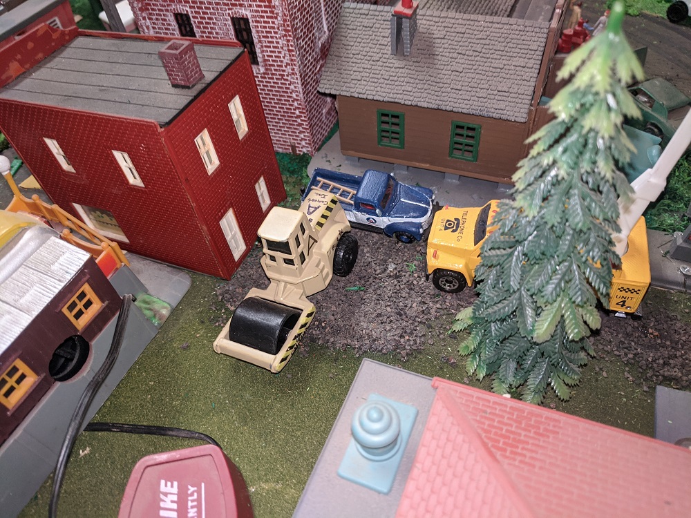 Multi dipping, got a few hours to enjoy leveling the foundations on some of New Armadilloville and setting up custom painted vehicles by Anderson Paint Shops and some vintage Matchbox and Lesney from RP. Clearances are very tight to accommodate the trolley bus and the train. Still haven't fired anything up yet, seem to be going at this in reverse order.