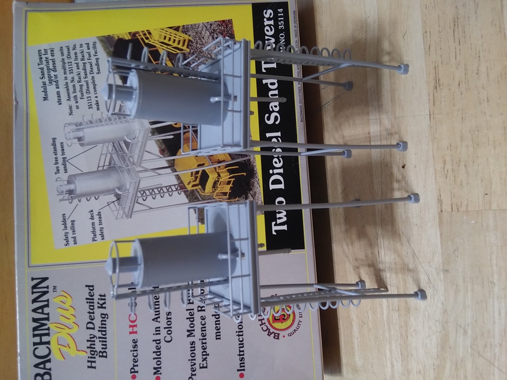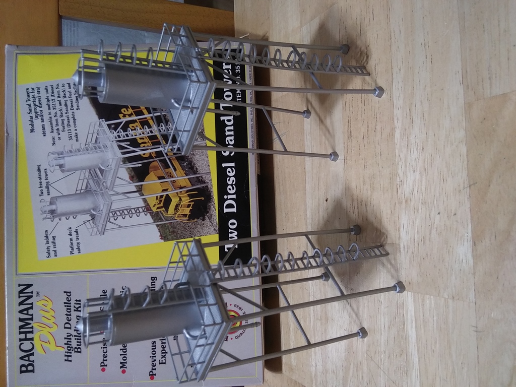 I built the HO-Scale Bachmann Plus 2 Diesel Sand Towers kit on Sunday, and just spray-painted the towers today. Overall, the assembly went smoothly - with the hardest part being gluing each of the little "u" shaped loops on the ladders, but being plastic, liquid cement was perfect for gluing together the parts. I used the same silver spray-paint that I used on the Stewart metal diesel fuel and water columns. Soon, a fully-fledged diesel maintenance facility will be put together in the engine yard of the EVRR 4'x8' mainline.