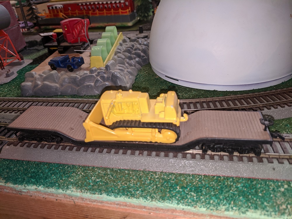 Heavy weight flat car from my Grandma Sally, one of my first pieces of HO. Eventually changed out the wheels to metal, now it tracks a lot better.