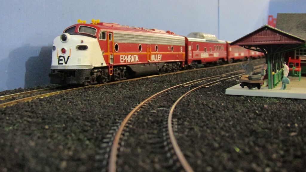 Ephrata Valley Railroad E9A #9, formerly an unpainted Model Power diesel locomotive, looking sharp hauling passenger coaches on the 4'x8'.