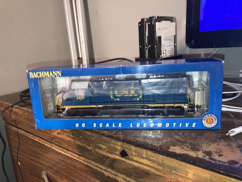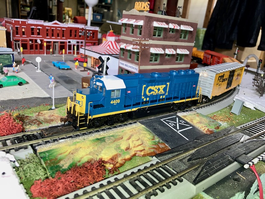 Bachmann's CSX GP40! This is the current DCC-ready model. The freight trains running through here technically use GP40-2s that were rebuilt around the 90s or 2000s that were originally Chessie units, but it's close enough. And several of said GP40-2s do indeed have the newer boxcar CSX logo. (Others are still in the Dark Future paint scheme, though.)