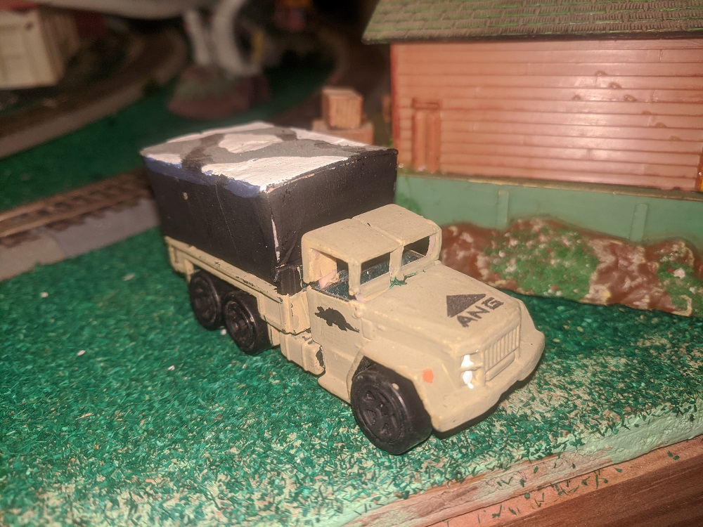 You know a piece is really good when you never get tired of looking at it. This awesome Armadilloville Natural Guard truck is one such example, from Anderson Paint Shops. I'd buy more of his work, but honest to armadillo, there just isn't one square inch to fit one more piece. I'd have to put in on some roof. I enjoy taking in the exquisite hand painted details- the perfect little armadillo silhouette, for example. It needs a better back scene, so tonight I'm going to give it a little patch of sawdust earth to rest upon. Until I moved the airport out (sold for a lousy 10 clams) it had to sit right behind T Rex's tail. Now it has a little breathing room and will be moved permanently to this spot, front and center.