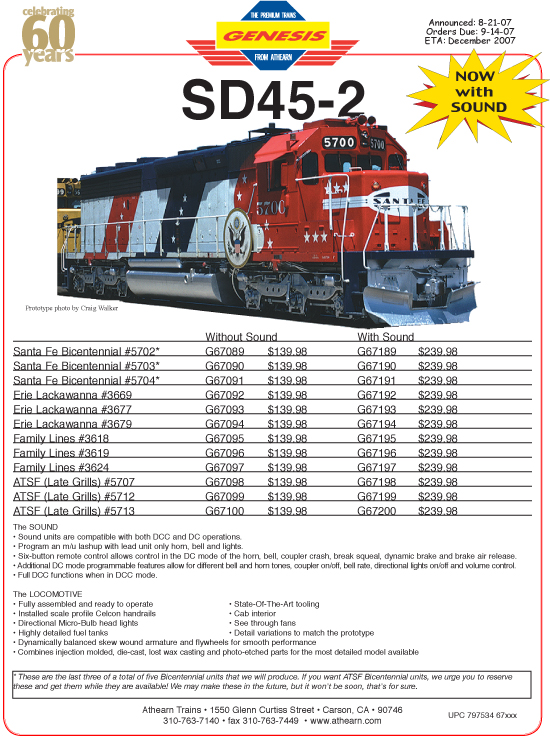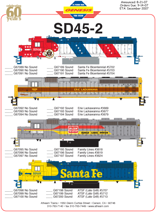 Athearn will announce this week a new run of SD45-2 in HO-scale that will include Erie Lackawanna and another run of ATSF Bicentennials.