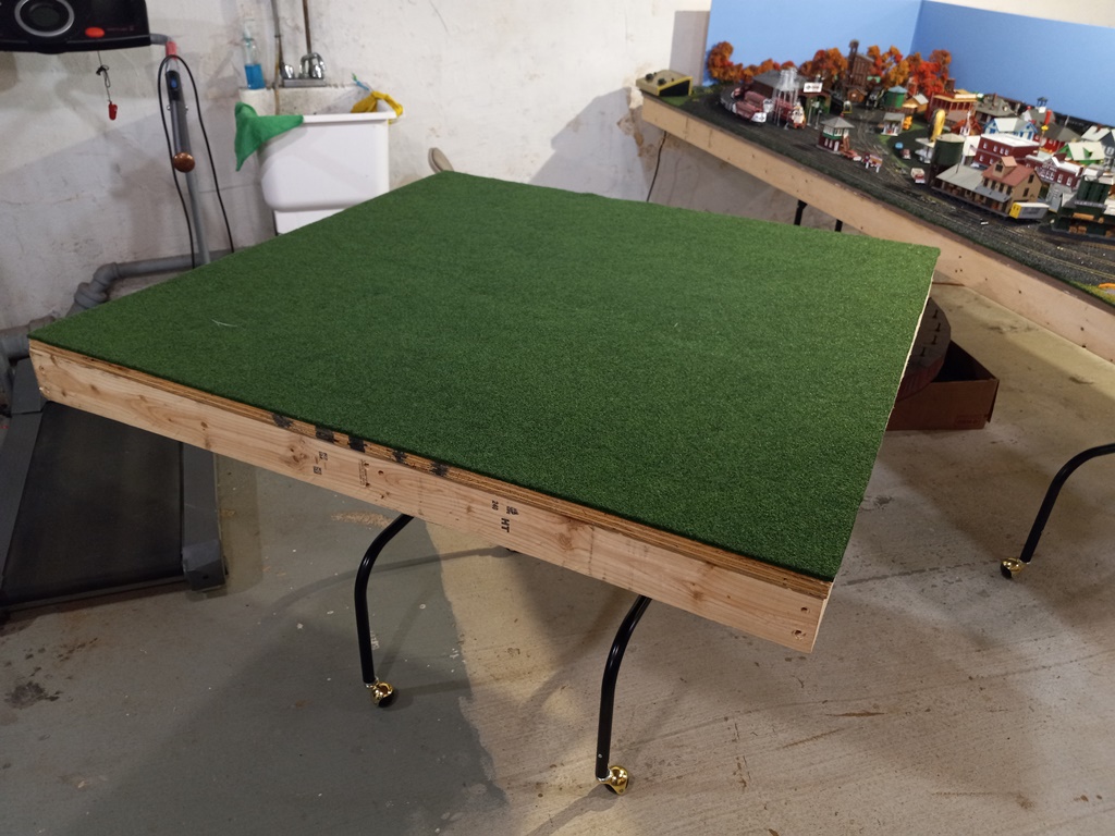 I happened to have a 4 foot wide, by about 4.5 foot long piece of green fabric left over from the 4x8 layout project, so I used it, and glued it to the tabletop.