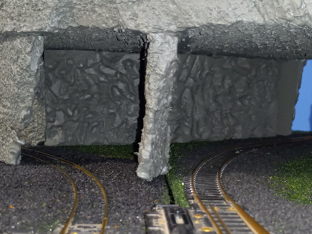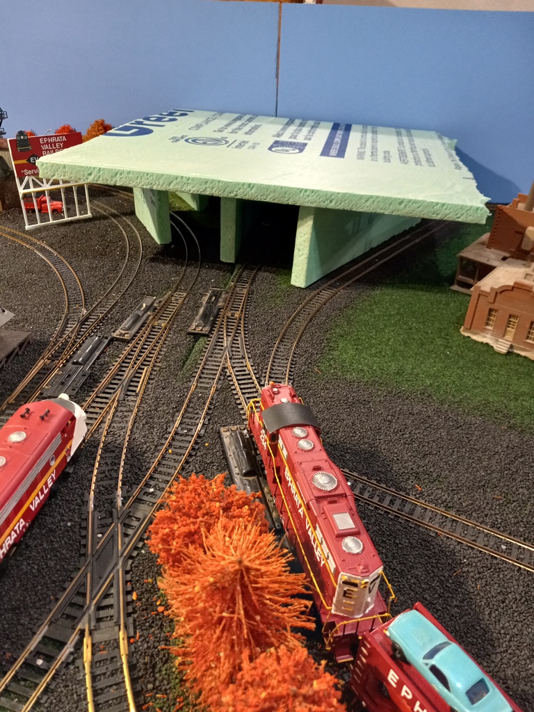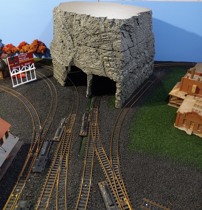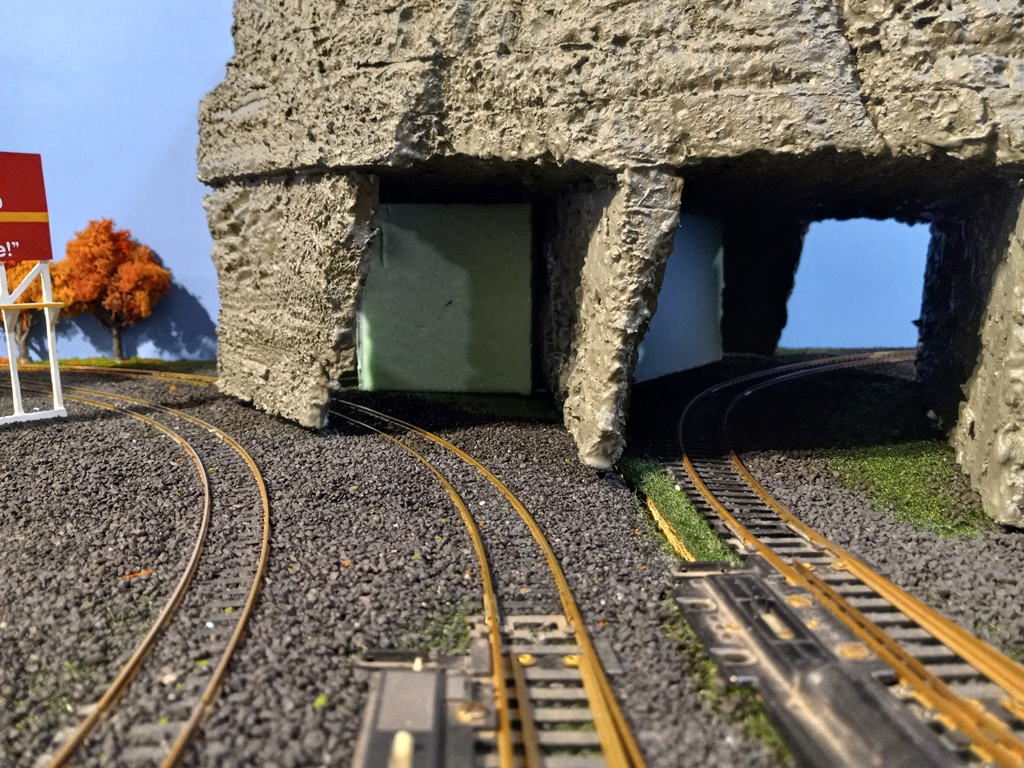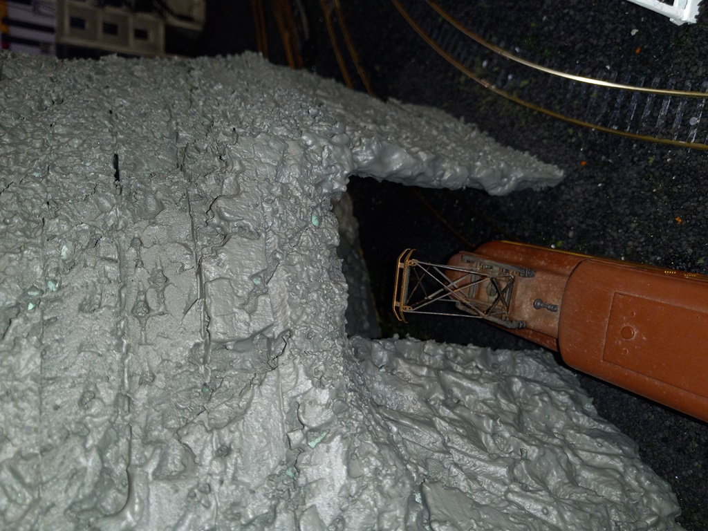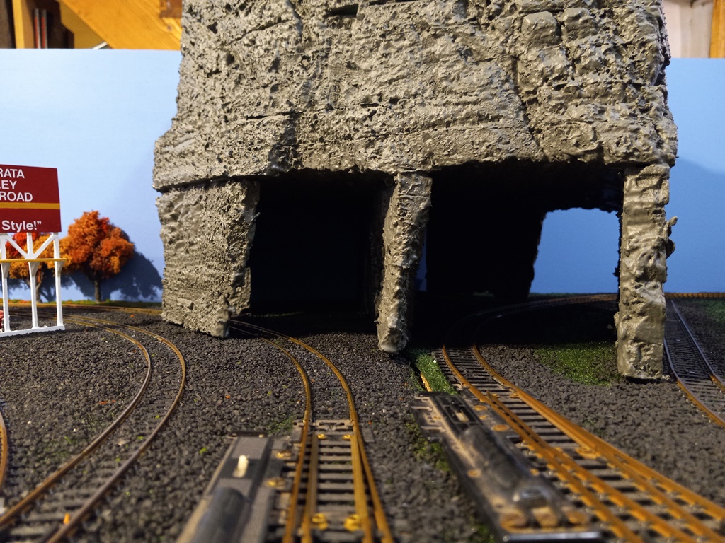 An improvement: I realized the tunnel openings were carved a bit too large (even for a GG1!) so I measured how much lower I could make the openings, and then cut, carved, and painted small pieces of foam to fit as best as possible.