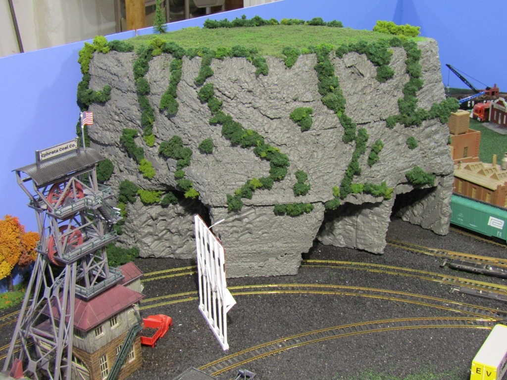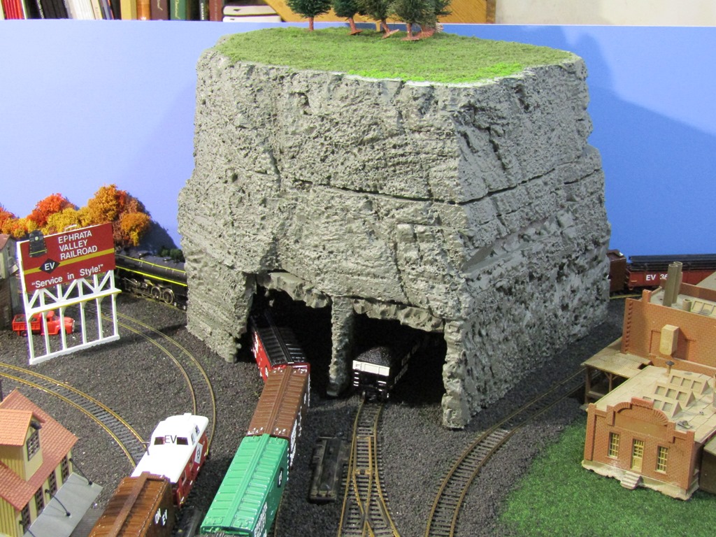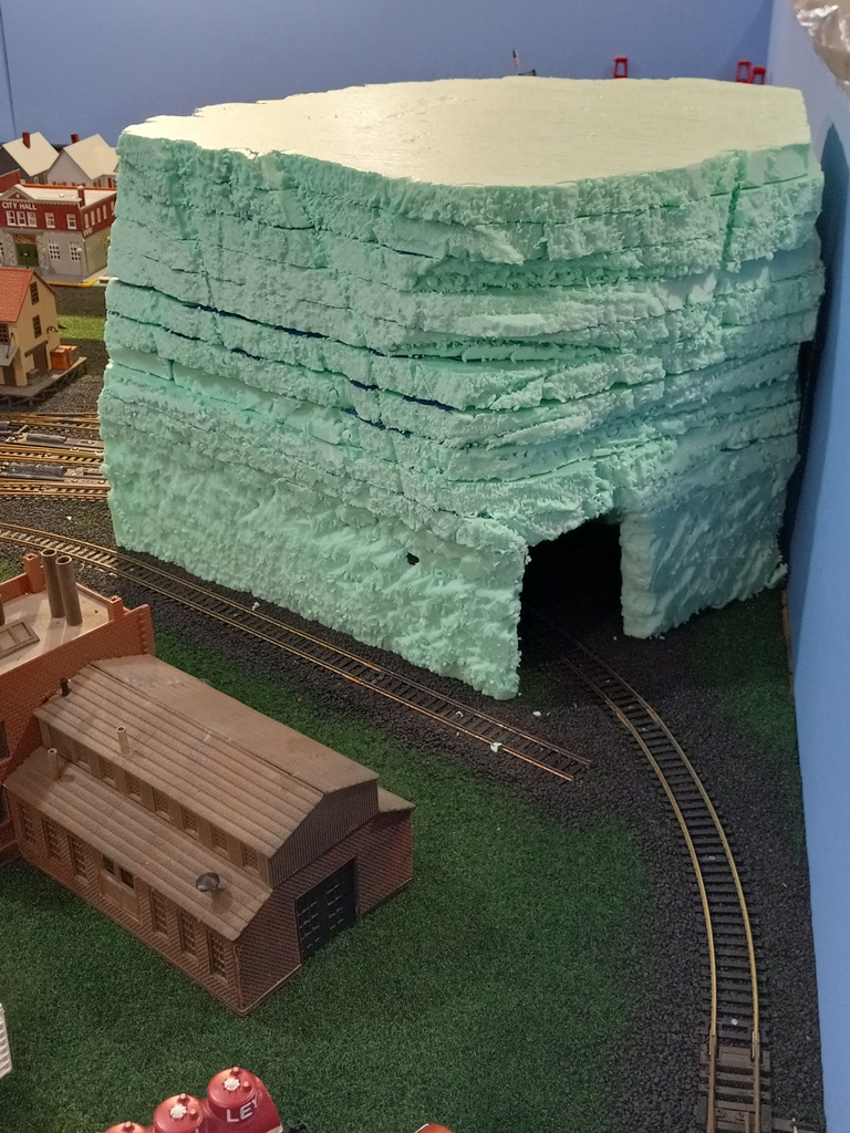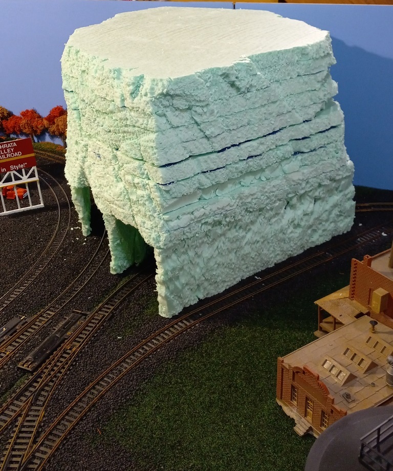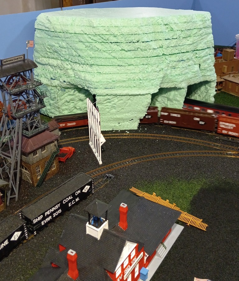 Now, I do realize that this mountain does not greatly resemble the Appalachian or Allegheny mountains seen here in PA, in fact it looks more like something that would be seen in the Rocky Mountains. But, considering the EV is fictitious, Mount Flat Top fits right in. In truth, I was inspired by others layouts with rough/rocky mountain scenery and tunnels, and found carving the foam to be quite fun.