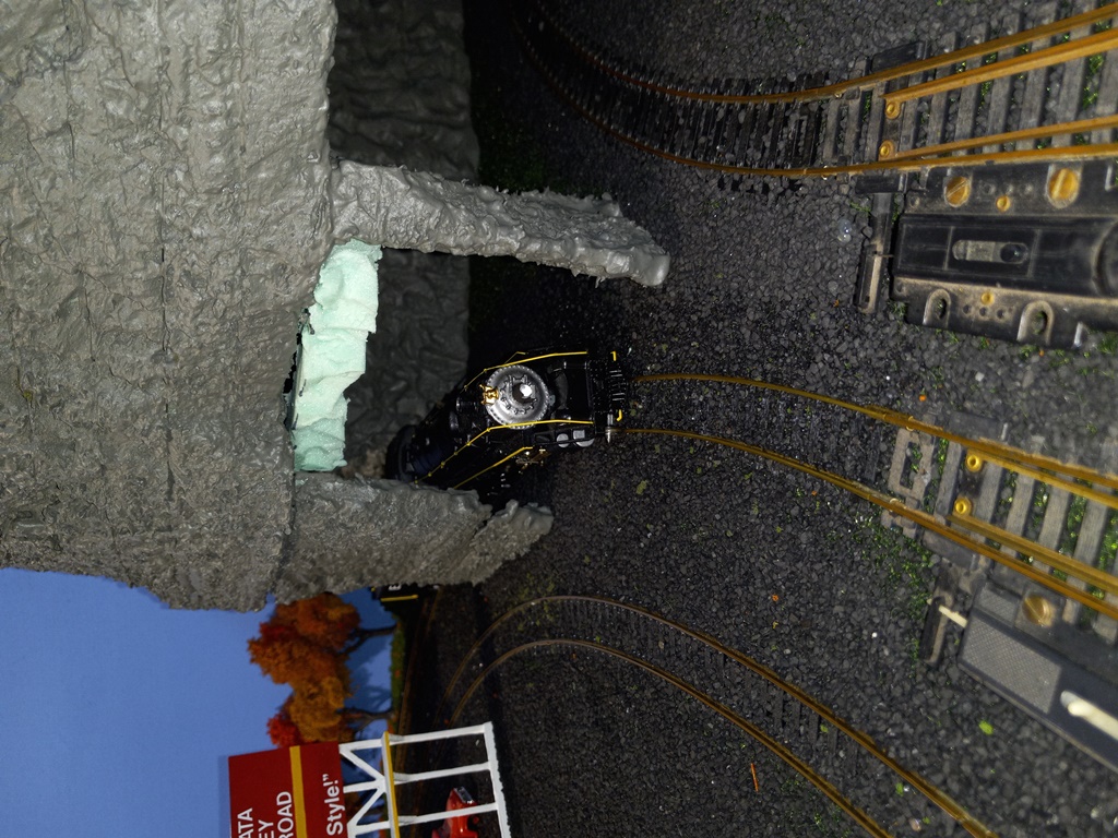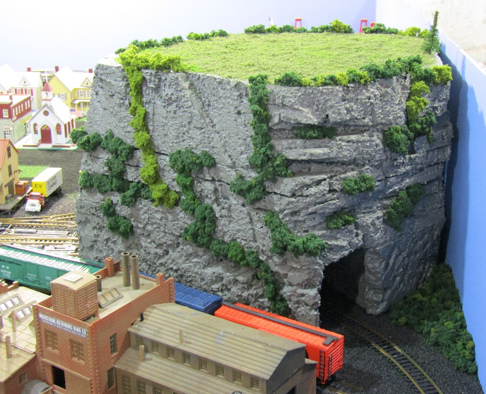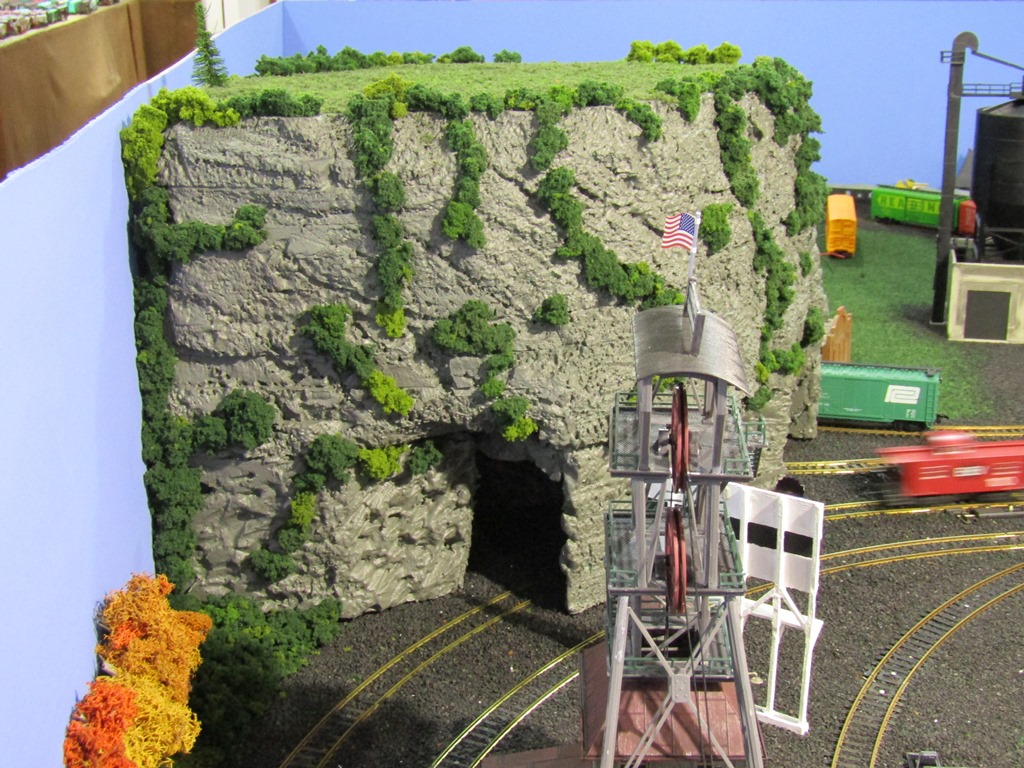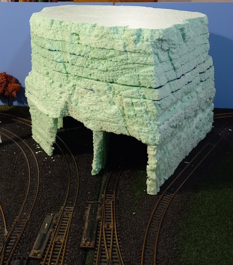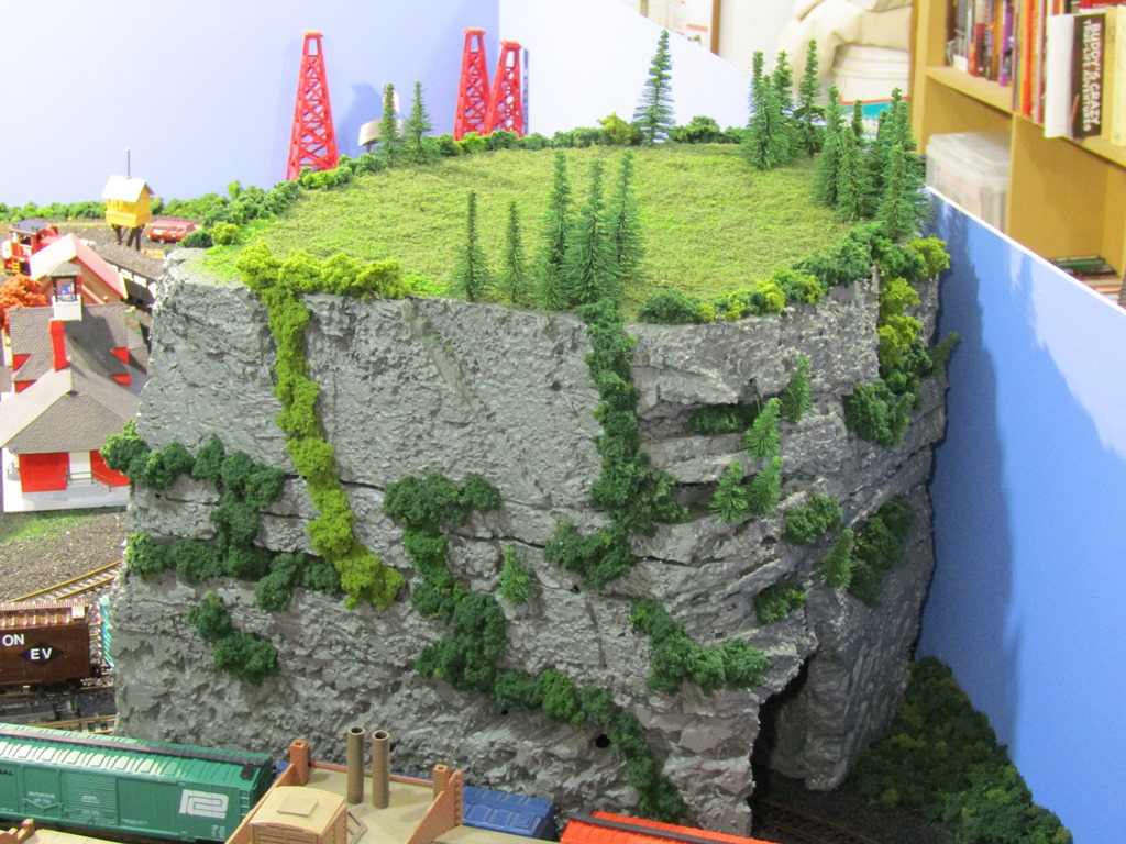Now, I do realize that this mountain does not greatly resemble the Appalachian or Allegheny mountains seen here in PA, in fact it looks more like something that would be seen in the Rocky Mountains. But, considering the EV is fictitious, Mount Flat Top fits right in. In truth, I was inspired by others layouts with rough/rocky mountain scenery and tunnels, and found carving the foam to be quite fun.