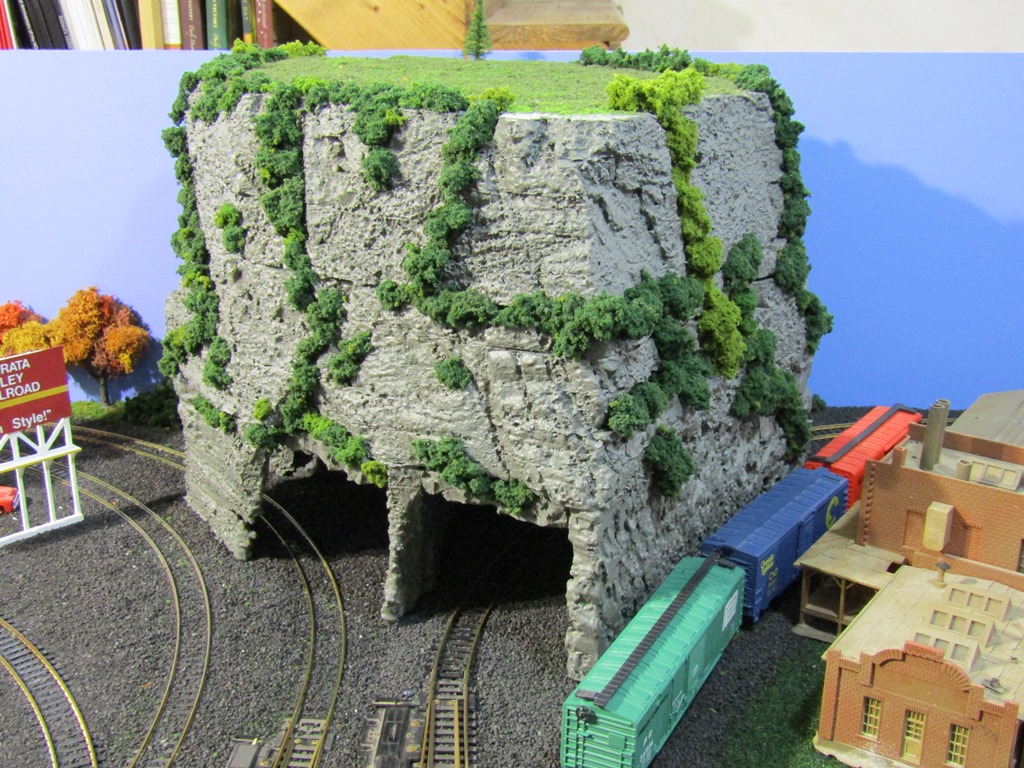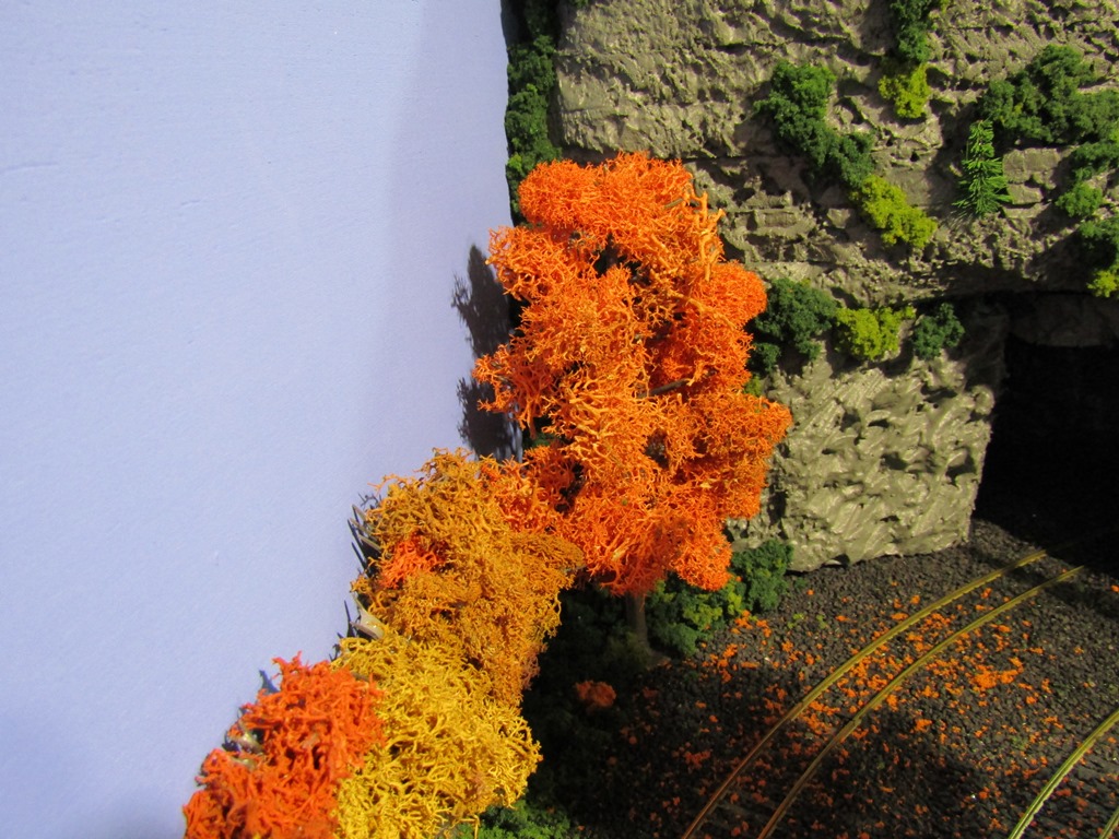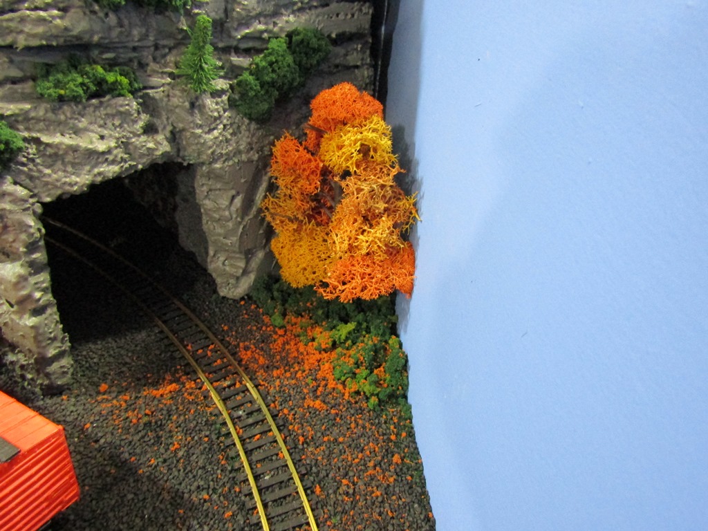 I built more autumn trees out of Woodland Scenics tree armatures and lichen, to match the others that were a big part of the scenery on the old 4x4 layout and now still make a great scene on the new layout. I placed 2 outside openings to the Mount Flat Top tunnels, and sprinkled some orange coarse turf on the ground.