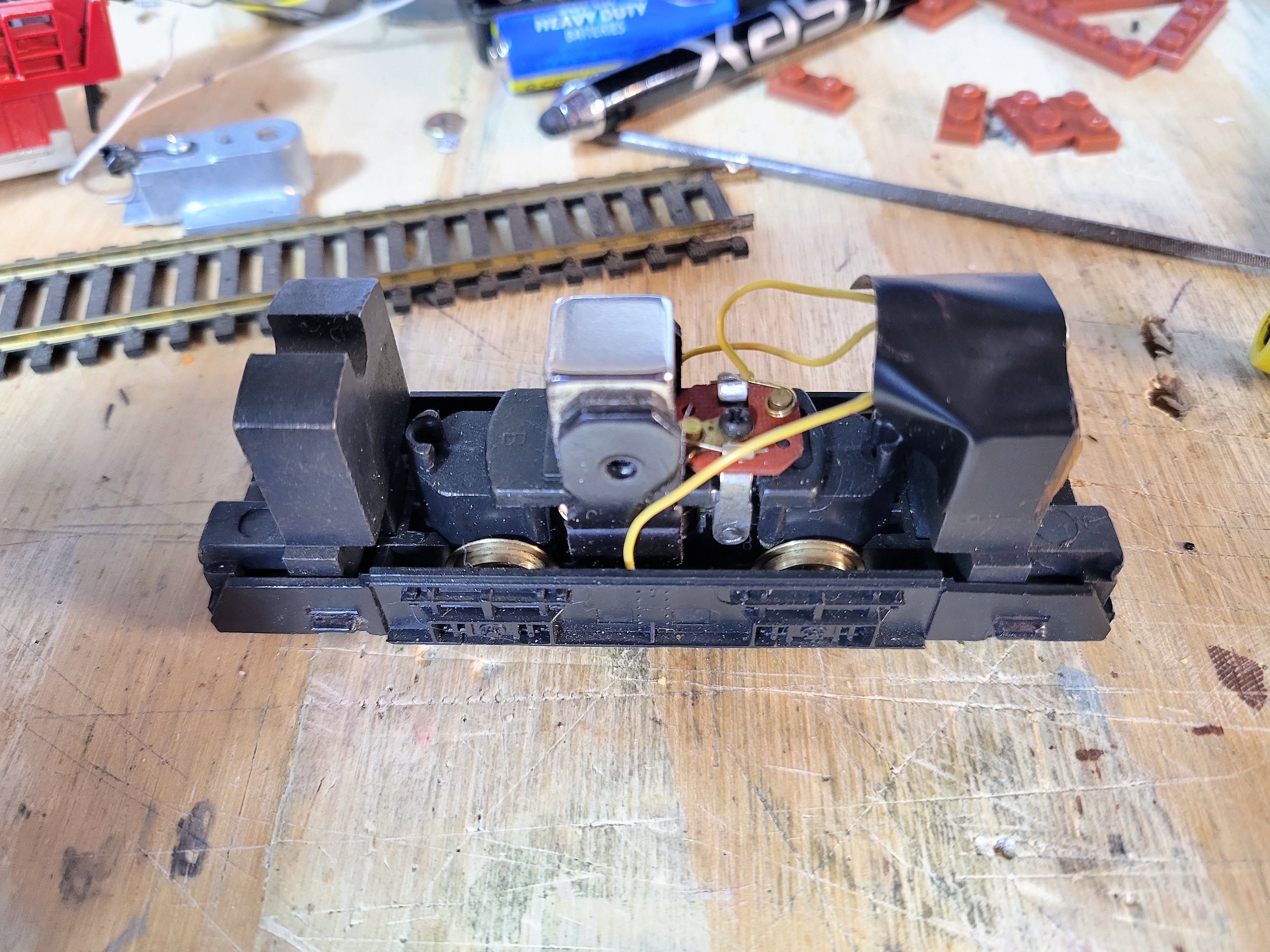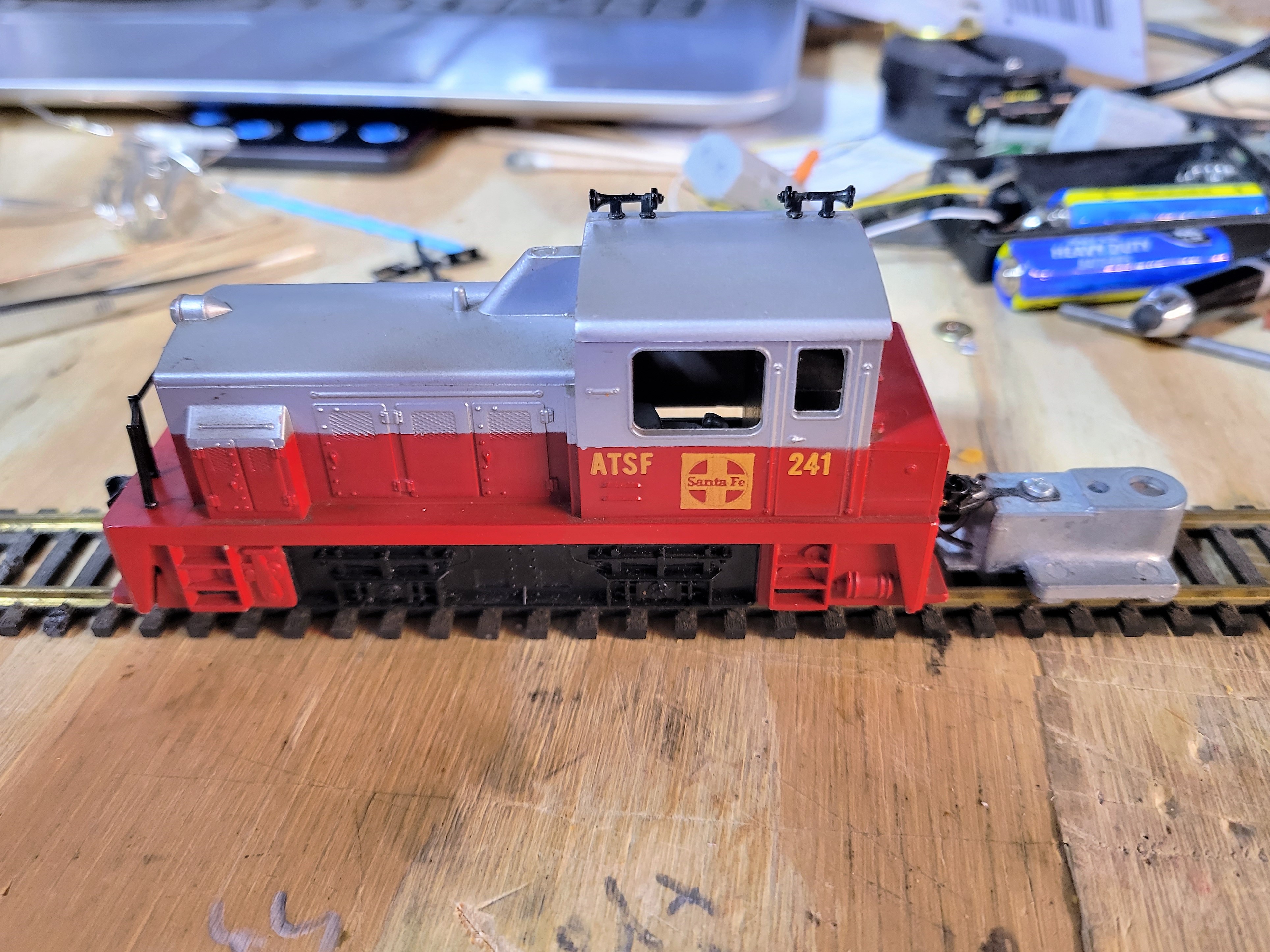 Found a Santa Fe Tyco switcher on Shop Goodwill a while back. It ran but the motor would get really hot after a couple minutes or operation so I replaced the magnet with a Neodymium 1/2 inch cube magnet. Now it runs great. Also I changed the couplers to Kadee #27's and want to change the bulbs to LED's.