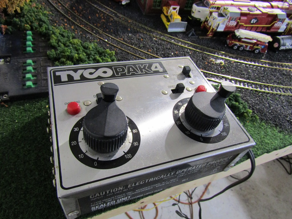 A $10 train store acquisition, this TycoPak4 dual cab control powerpack is not all that common, and this one is in good health, electronically speaking. I decided to have it control both the inner and outer tracks on the EVRR.