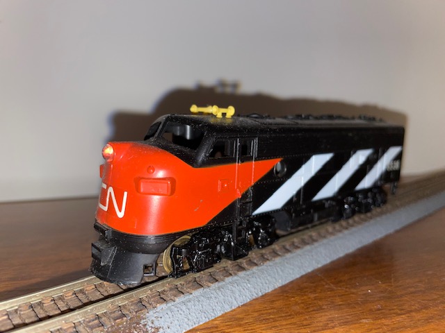 The F7s were available in PRR, Santa Fe and Canadian Pacific. They are a smooth running diesel with all wheel drive and a DCC plug. Sadly, Neither Model Power nor this line are being made any more. This is the second Metal Train F7 I own, the first one being a PRR unit that hit the floor and broke the pilot. It sits unused because I can;t get the replacement pilot, and until I figure out how to make a new one I;ll leave it on the shelf.