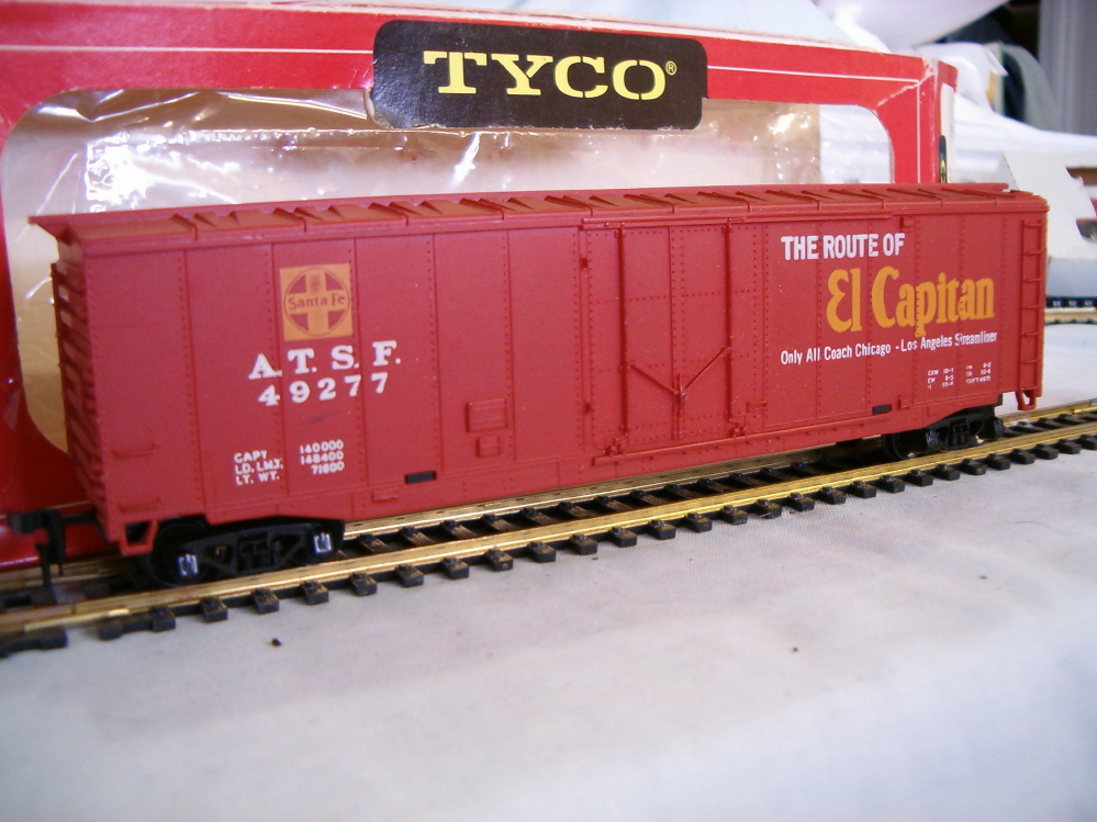 Been going thru' a box of old railway cars & found a TYCO red box ... " Box Car 50Ft Plug Door Santa Fe # 339A:300 with a Santa Fe El Capitan car inside .....
