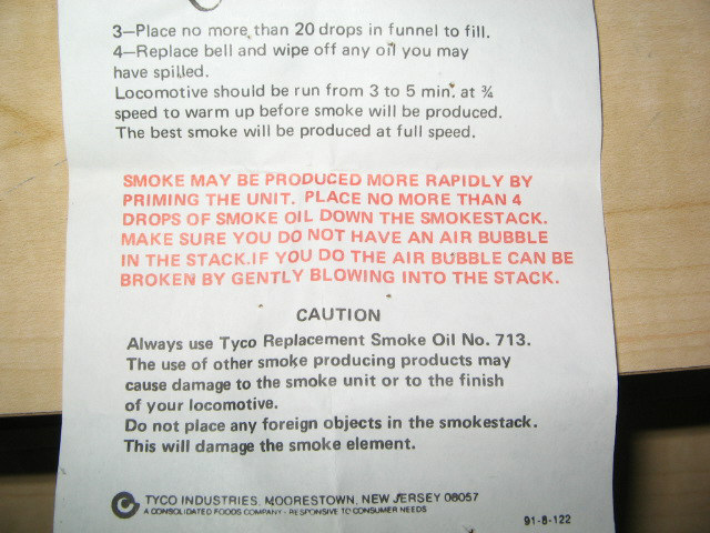 These are the factory instructions for adding smoke oil to Tyco smoking steam engines.