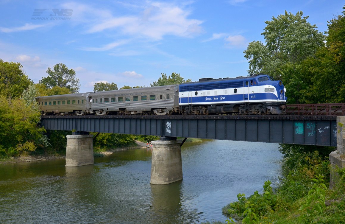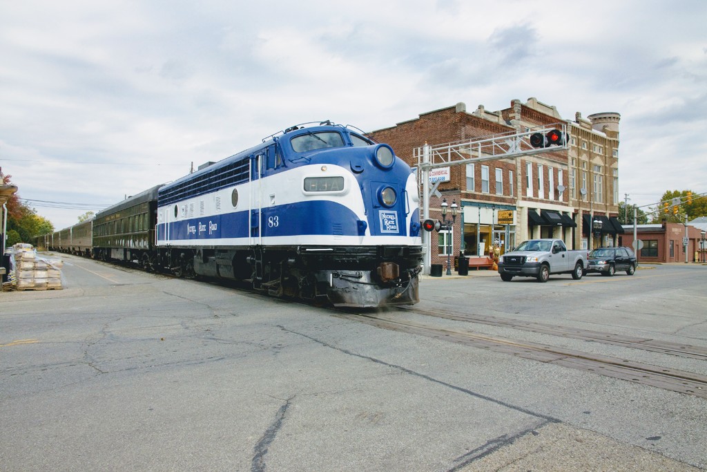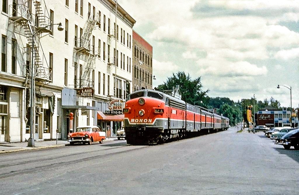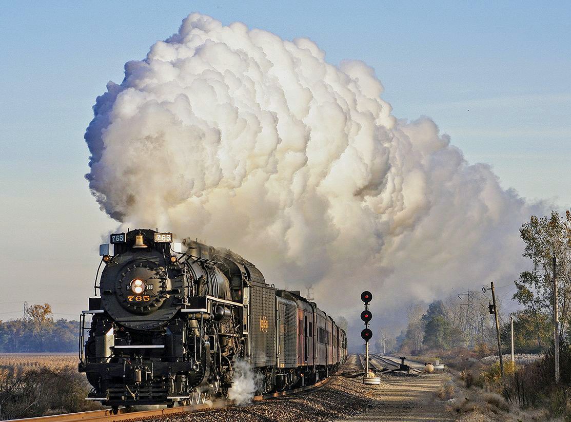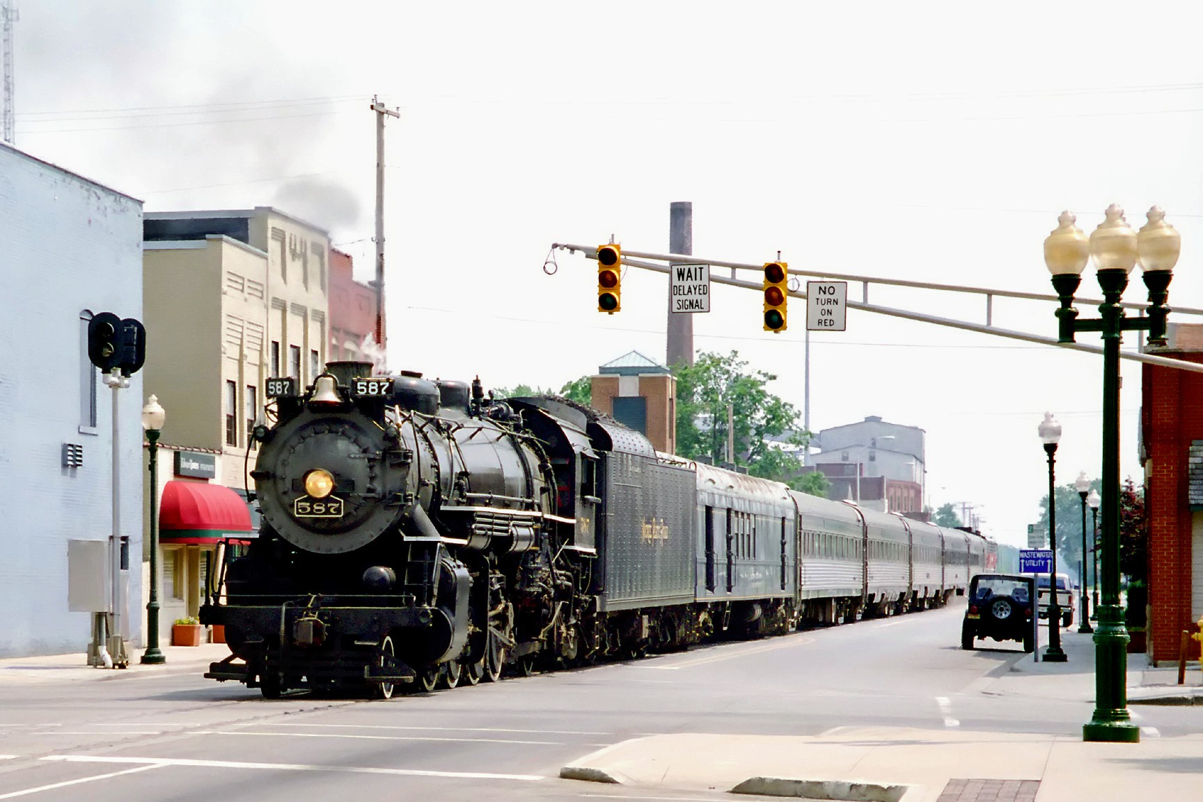 Classic steam engine sharing the road with modern cars. Nickle Plate 587 at Noblesville Indiana in June 1998. At South 8 Street heading back to Hobbs Station.