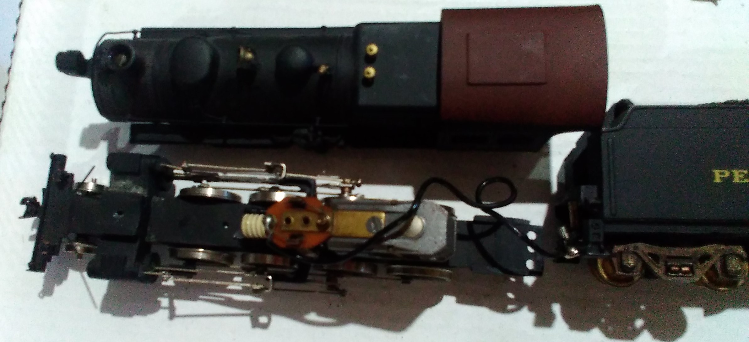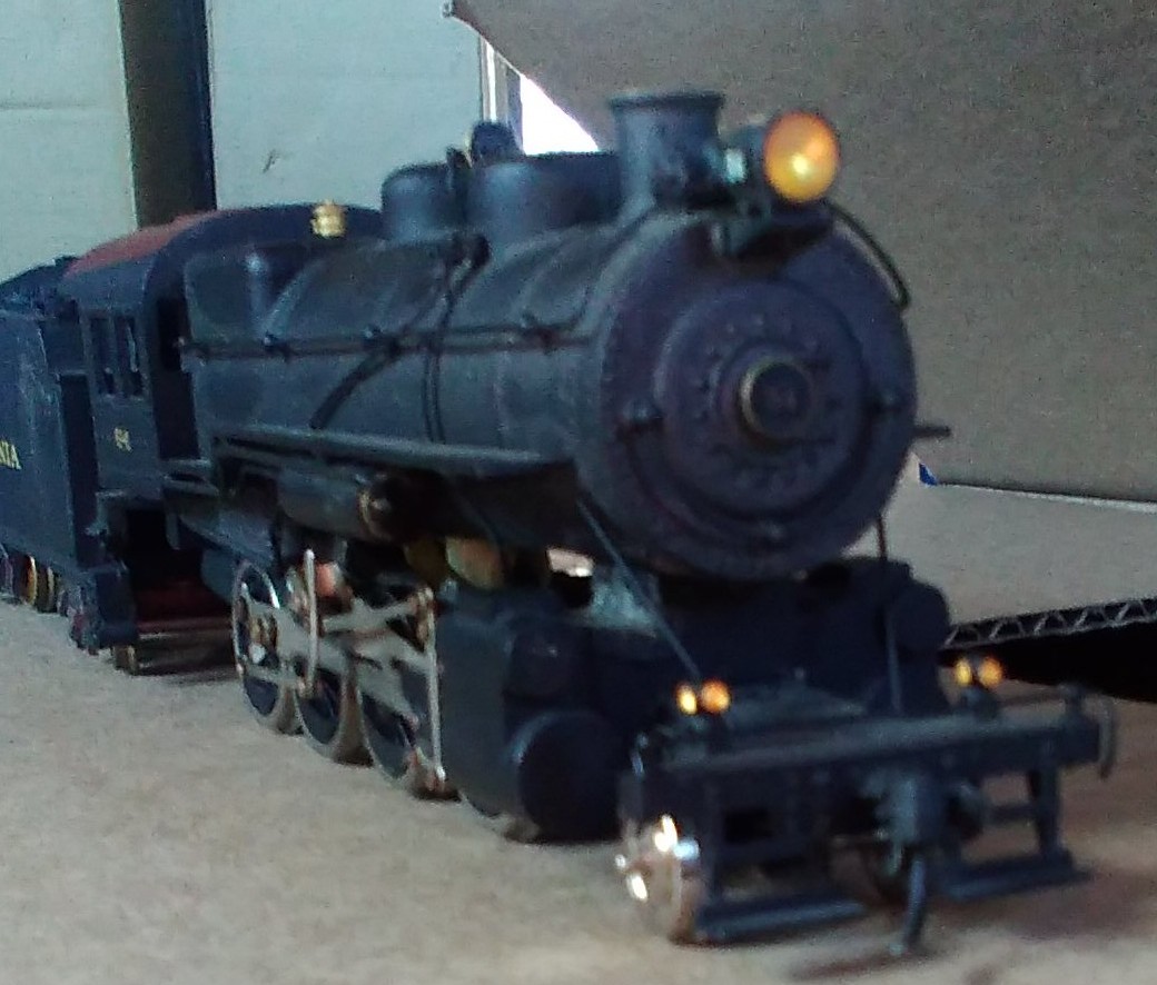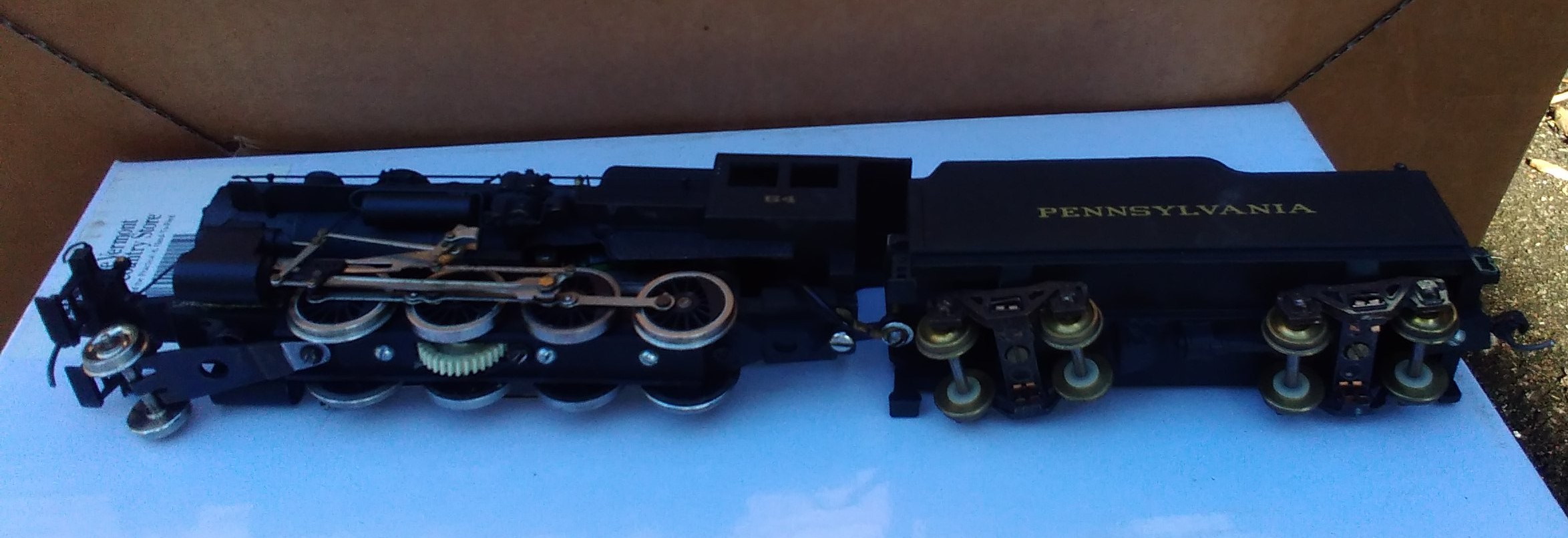 It is all heavy die-cast. No visible maker's marking. The boiler looks like one of Varney/Penn Line/MDC. The boiler and cab are one casting. The drive assembly looks like Mantua/TYCO from a 2-8-2. The valve hanger is part of the die-cast boiler. The tender looks like Penn Line/Bowser. The steam chest has no piping to the boiler. Also the steam chest center hole is tapped having a screw in the frame to hold it in place. No longer a pain to get the valve gear aligned when the steam chest falls away from the frame during disassembly. The boiler front is held by a screw in the smoke stack to the steam chest. Engine cab has 2 brass screws up from the fame rear. It runs well like a typical Mantua/TYCO die-cast steamer.