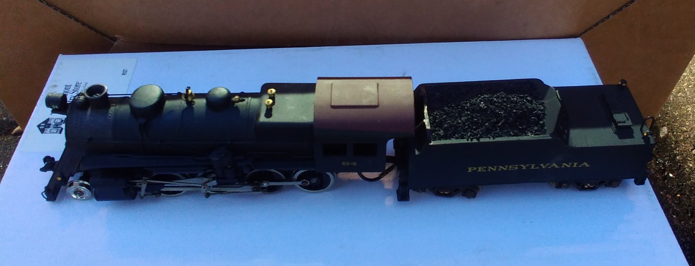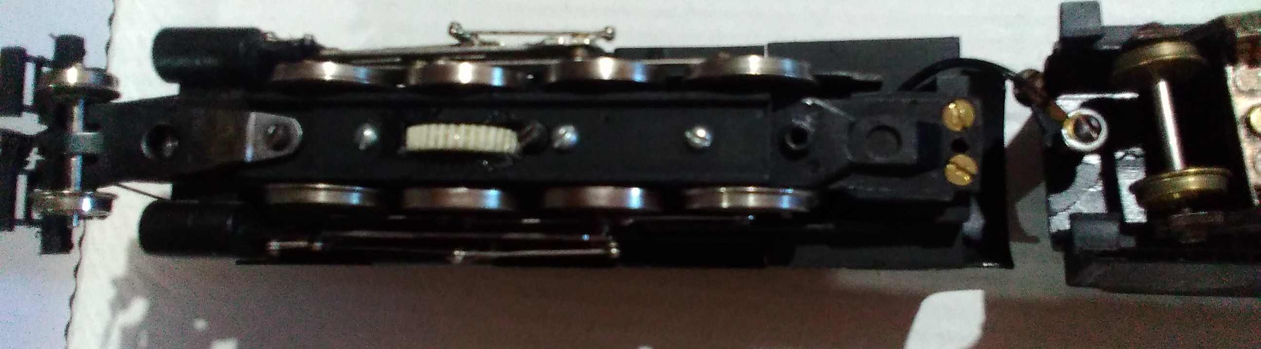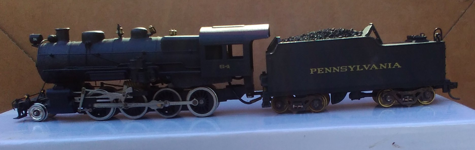 It is all heavy die-cast. No visible maker's marking. The boiler looks like one of Varney/Penn Line/MDC. The boiler and cab are one casting. The drive assembly looks like Mantua/TYCO from a 2-8-2. The valve hanger is part of the die-cast boiler. The tender looks like Penn Line/Bowser. The steam chest has no piping to the boiler. Also the steam chest center hole is tapped having a screw in the frame to hold it in place. No longer a pain to get the valve gear aligned when the steam chest falls away from the frame during disassembly. The boiler front is held by a screw in the smoke stack to the steam chest. Engine cab has 2 brass screws up from the fame rear. It runs well like a typical Mantua/TYCO die-cast steamer.