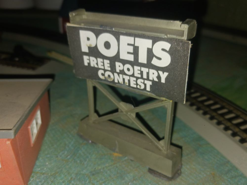 Made with a Tyco trestle, I concocted this inane billboard. I came from a big college town (six institutions of higher learning, including a very nice community college), so it was my way of poking fun of my hometown area.