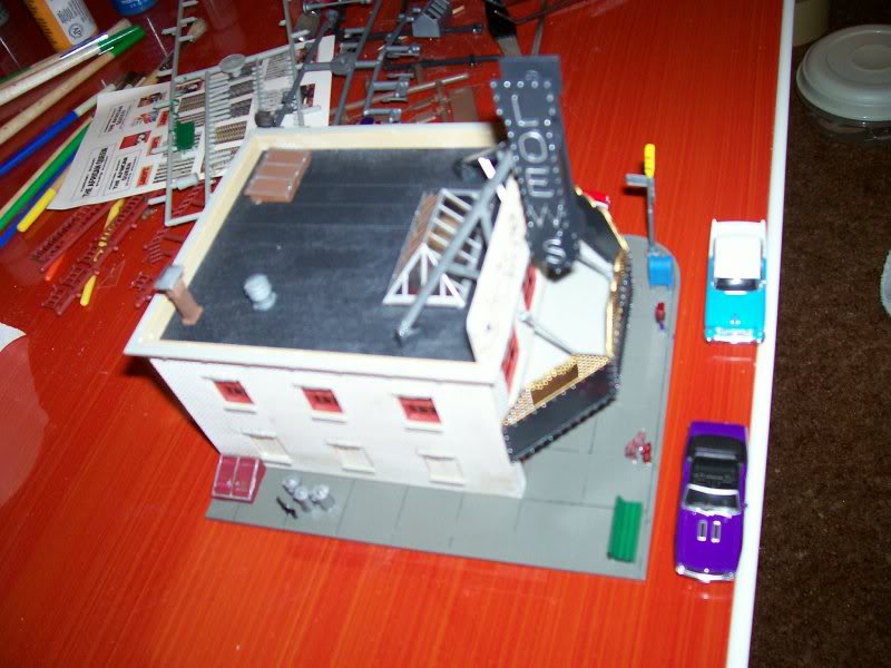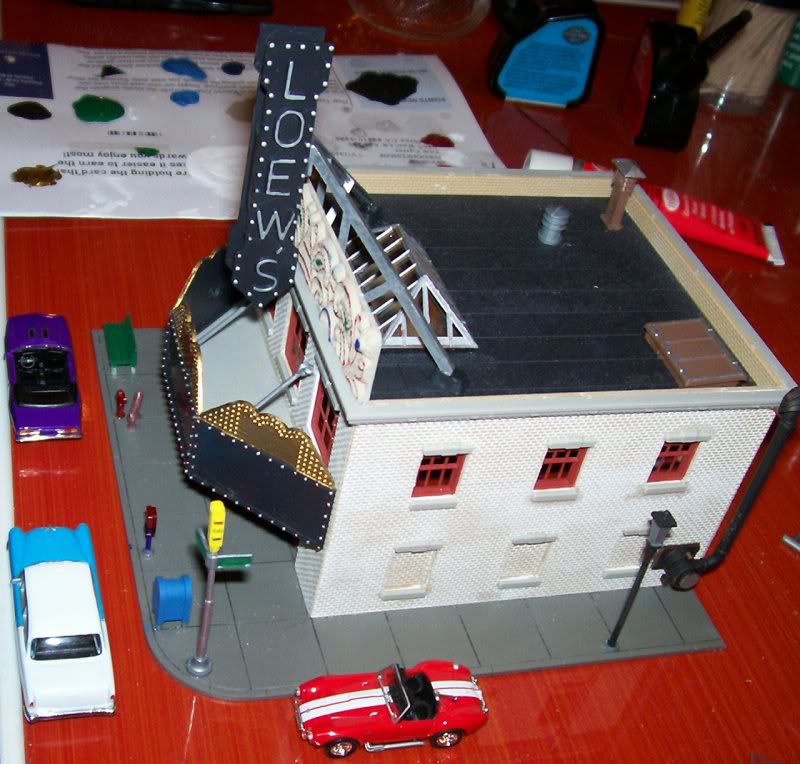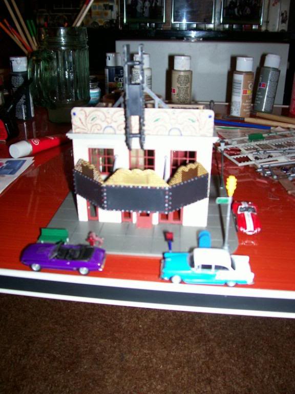 I haven't added the marquee signs and movie posters, as I don't know where this building will end up. I was thinking of "Blazing Saddles" since it is my favorite movie, but that dates whatever layout I put it on (if I ever do) at 1974. My layout is 1962, so that is out. When and if I ever do, I'll add the marquee signs and posters, until then, it'll just sit in one of my display cabinets.