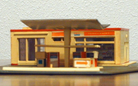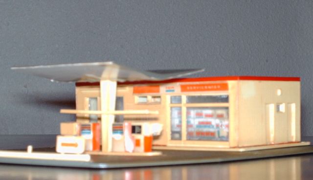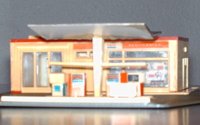 The Great One picked up this Tyco lighted gas station for me today. The gas pump and oil rack stickers seem to be a little different than any pictures I have seen of this kit. Also the red trim around the base and top of the building is new to me. I thought maybe the red was painted on but on closer inspection the red trim is molded in red. The bottom of the base says Tyco kit made by Pola W. Germany. As you can see, the building has a lot of cig. smoke discoloration. If anyone can put a timeline on this or just give a run down on it that would be great.