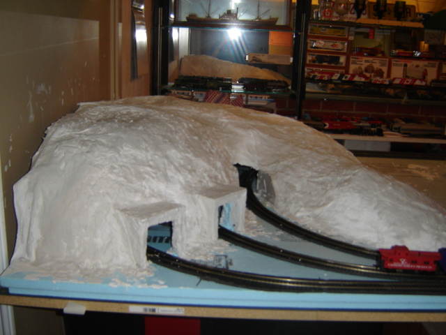 | Hi CHEEZ--They look great. You should consider Woodland scenics tunnel portals--They really enhance the openings. I hope you made a cut out in center to get to any derailments--when i built my first mtn--train ran fine and then derailed-had to get jig saw and cut out holes to retrieve train--easier to install access before built than after. Use flat green or brown spray paint on the plaster before adding earth materials or leave white for snow capped mtns--just a suggestion on the paint.