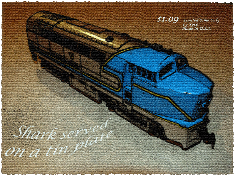Hi Garret. These Shark Attack posts which I've started are nothing more than Tyco or Mantua sharks which I've photographed and then worked some photoshop magic upon. This one here is actually just a plain old Tyco PLASTIC shark which I've morphed into something which really does look like Tin Plate. I then played on the words and made into a place mat you might have come across years ago at a Howard Johnsons or similar.