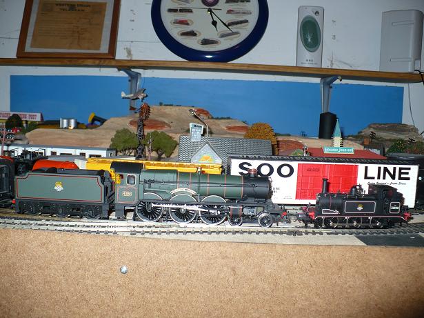 | Good to hear from you, Catfordken...sure looks like the photo you sent, but it doesn't seem to be Hornby, someone called Dapol, out of Hong Kong.  I absolutely trust you that the Hornby would have been made 1:76, but on this little guy, you would have had to been under 5 feet tall to be the loco driver! (the loco #'s are different also).  I think the bug bit me, though, and I traded a couple of items to my local shop today and brought home what is, without a doubt, "OO." Please don't make me explain the Soo Line Hi-Cube in the background, though!  Interesting thing about my 'new' loco, I disassembled it to clean and oil everything, and it has a pancake-type motor, ala, the Powertorque--but it seems to run much better.  At any rate, if I do any serious British modelling, I think I'll try to buy British and not Chinese!   |