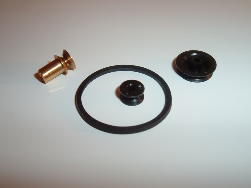 Gareth, here are the pulleys I considered. I ended up with the small brass pulley on the motor, and the large black pulley on the input shaft to the gearbox. The large one came from a big dual cassette deck, so it started out as two pulleys in one that I had to saw apart. The diameter was perfect for the clearances in the frame. The belt is the shortest one I've ever found - I think it might be from a shelf stereo.