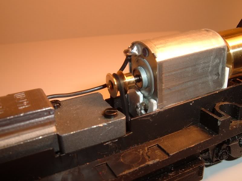 I built a styrene cradle for the motor, and used heavy-duty double-sided tape to hold the motor down, which provides some sound-deadening. The cradle is tacked in with hot melt, because I needed something solid but removable. It runs well, but the A-Line flywheel is slightly uneven and causes a roar, so I have to remove it and try another. I can't really use anything soft like RTV to mount the motor because of the pull from the belt. I sidelined the project a while ago in favor of more pressing jobs.