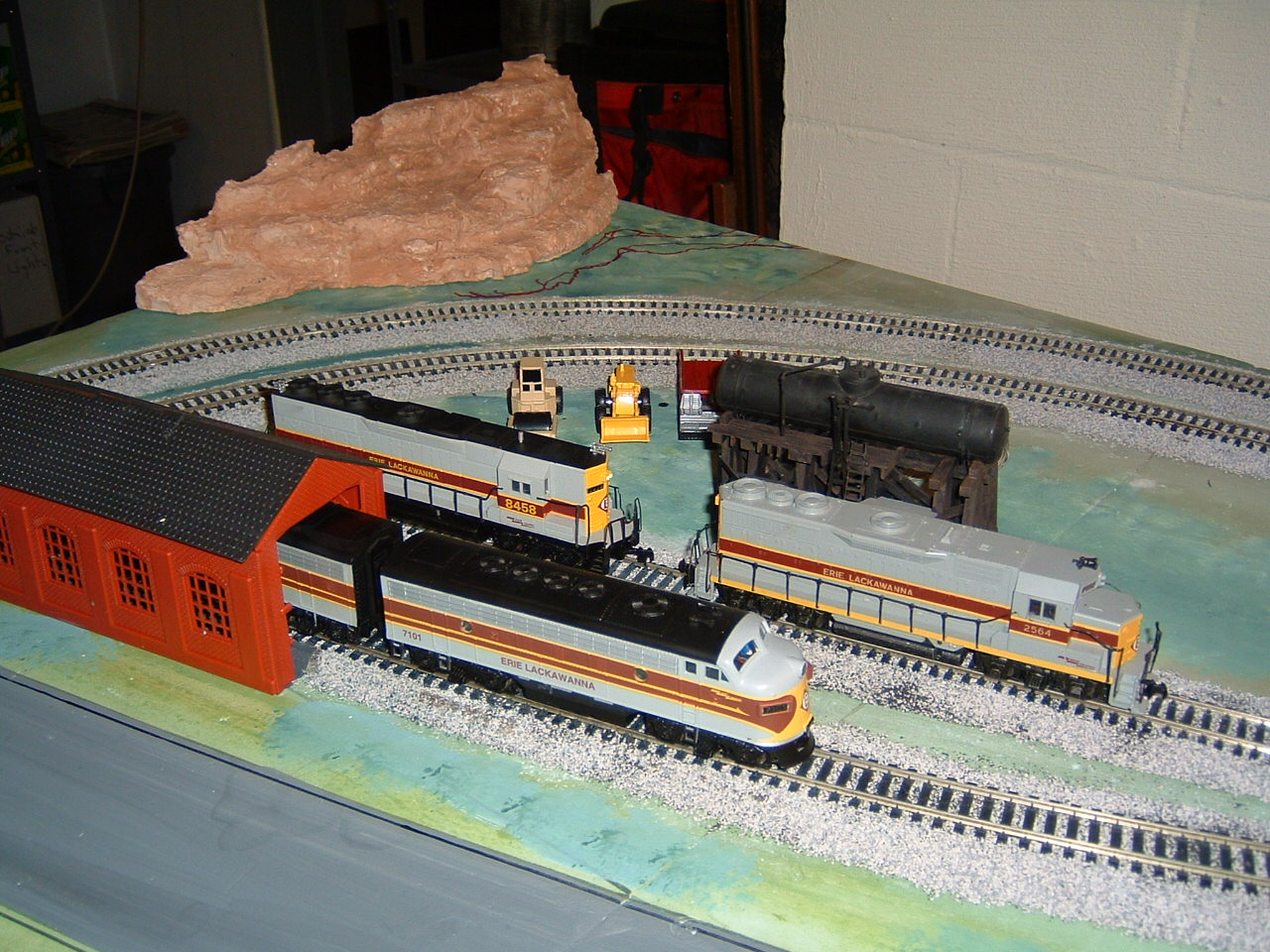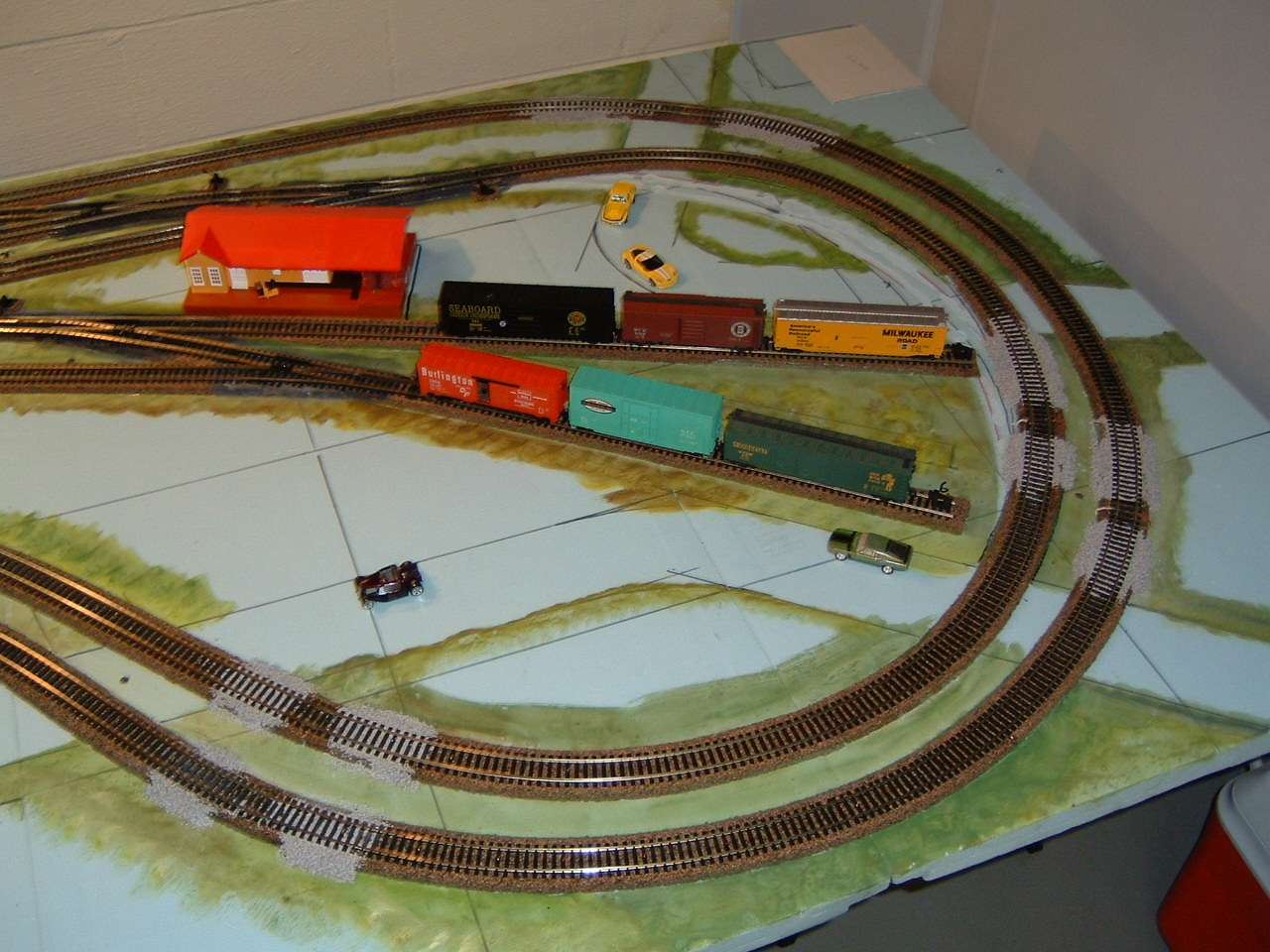 It is not latge...12' x 4' for now, can add a small L at the right side of 6' by maybe 3' to 4' if I need to some day. Runs the el and an occassional penn or nyc, based in ohio in the early to mid sixtys... is a variation of a dog bone that I found, modified the plan...has one main line loop and a point to point switching track inside, called it the stoney creek