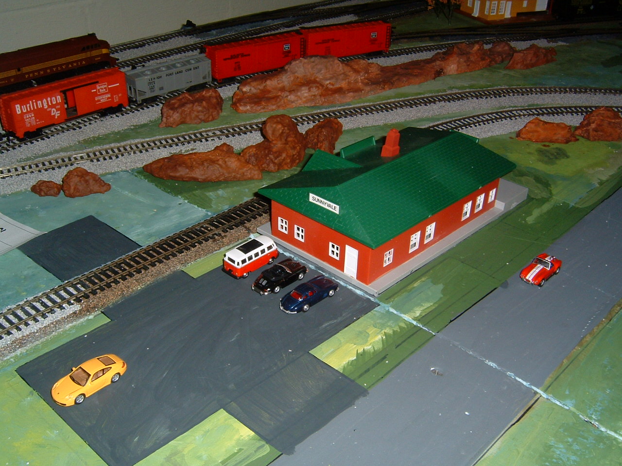 because of the rock formations an a small creek that will run on two of three of the corners, have a lot of items for it that I am doing a little kit bashing on... the passenger station and the freight are in the process of being modified right now...nothing is really complete except the wiring of the track... the control box for now is a modified shoe box until I get to build one...