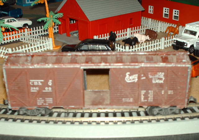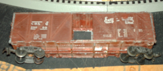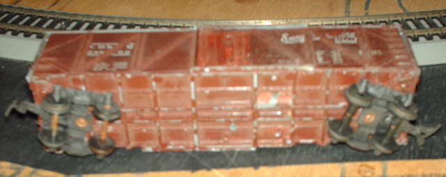 Can anyone tell me who made this car and when? It is all metal with plastic trucks. It came in a box of trains the Great One gave me a while back. The bottom was hand painted by someone so if there was a mfr. mark it is covered up. It looks like you had to put it together yourself. Sorry about the picture quality.