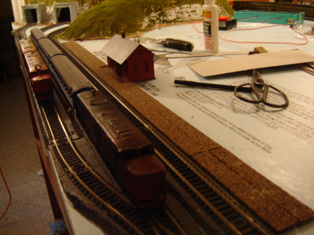 Hey guys. I've finally started working on my layout again, and yesterday I started the station. I put down a strip of cork (to bring the platform to track height) and I cut out a piece where the station building will fit in. I'm not sure what to use for the top of the platform. I was thinking some cereal box cardboard painted like cement. Does anyone have any other ideas? Also, does anyone know a good paint to use to simulate concrete/cement?